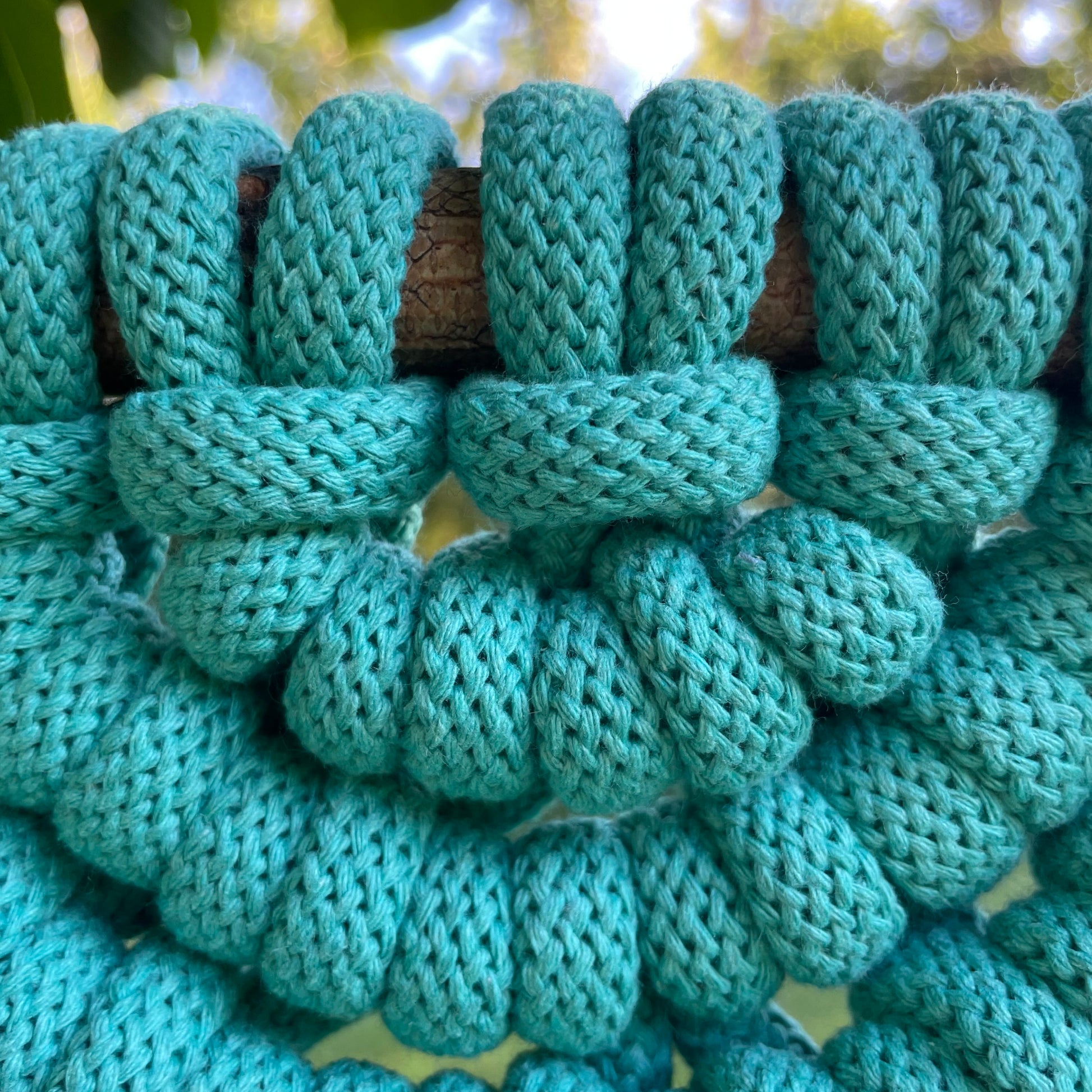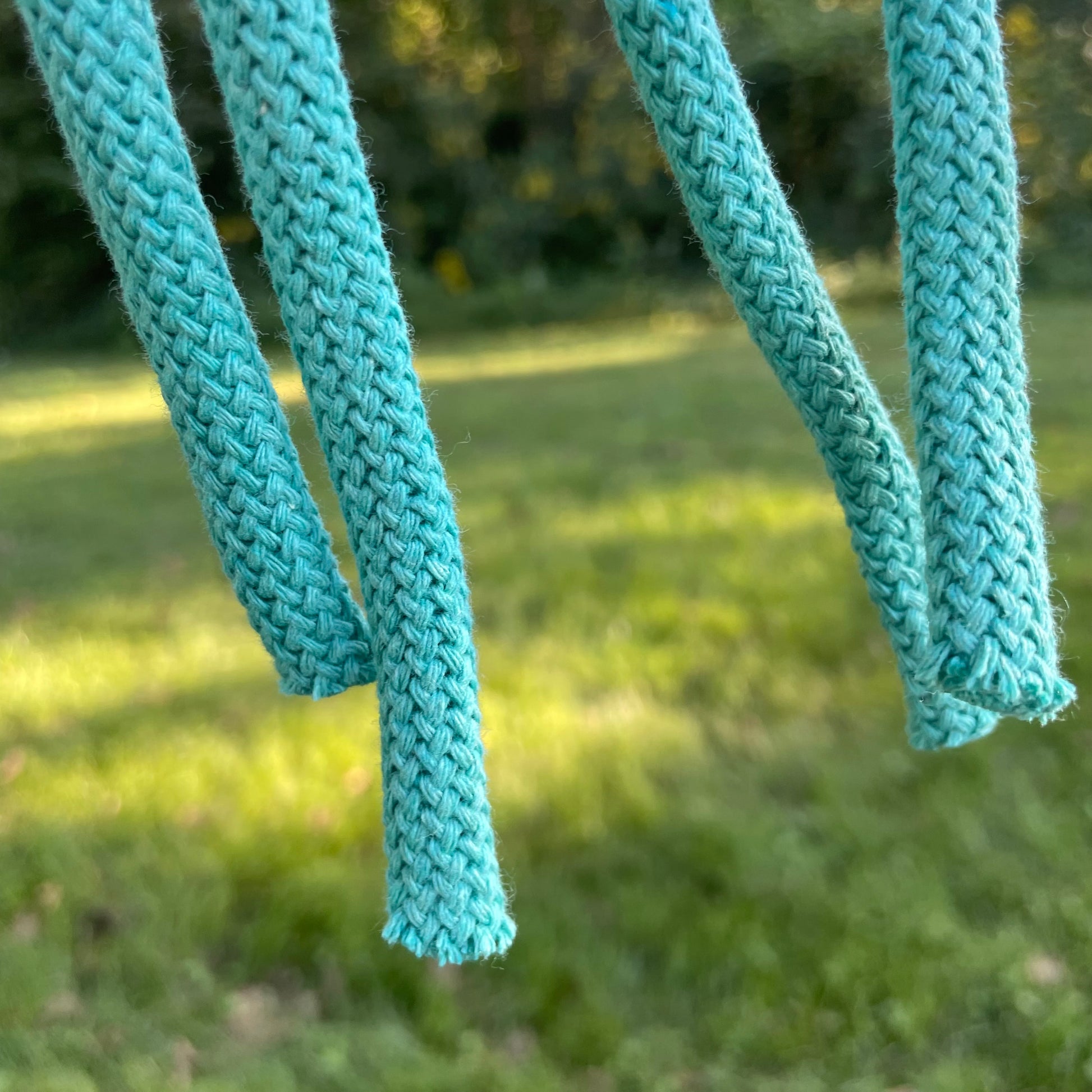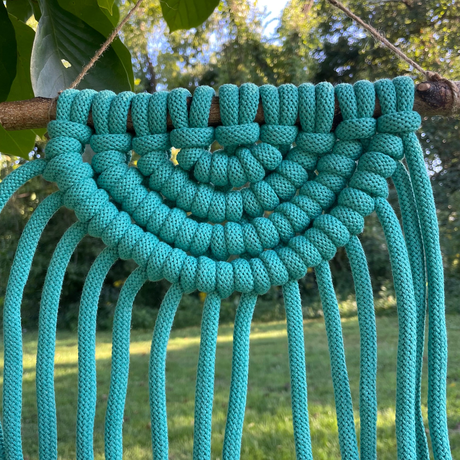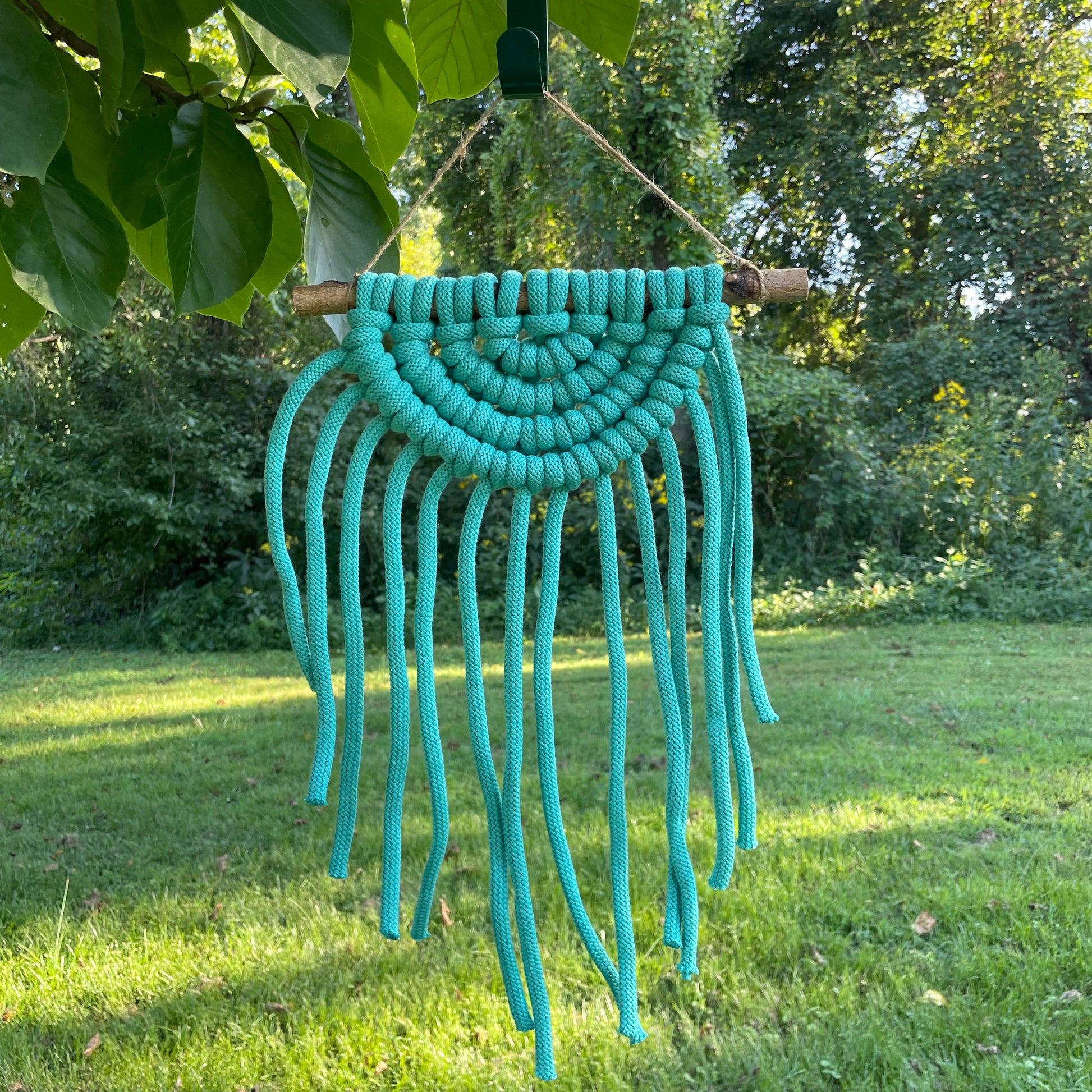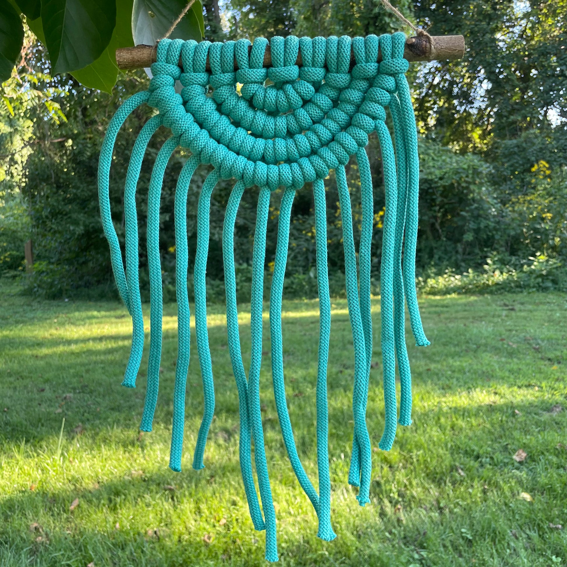 Upgrade your space with this trendy semicircle wall hanging, crafted from high-quality 9mm turquoise cord. Not only does it add a pop of color, but its funky design is sure to impress. Measuring at 12 inches wide and 24 inches long, it's a must-have for any room (and any selfie background).