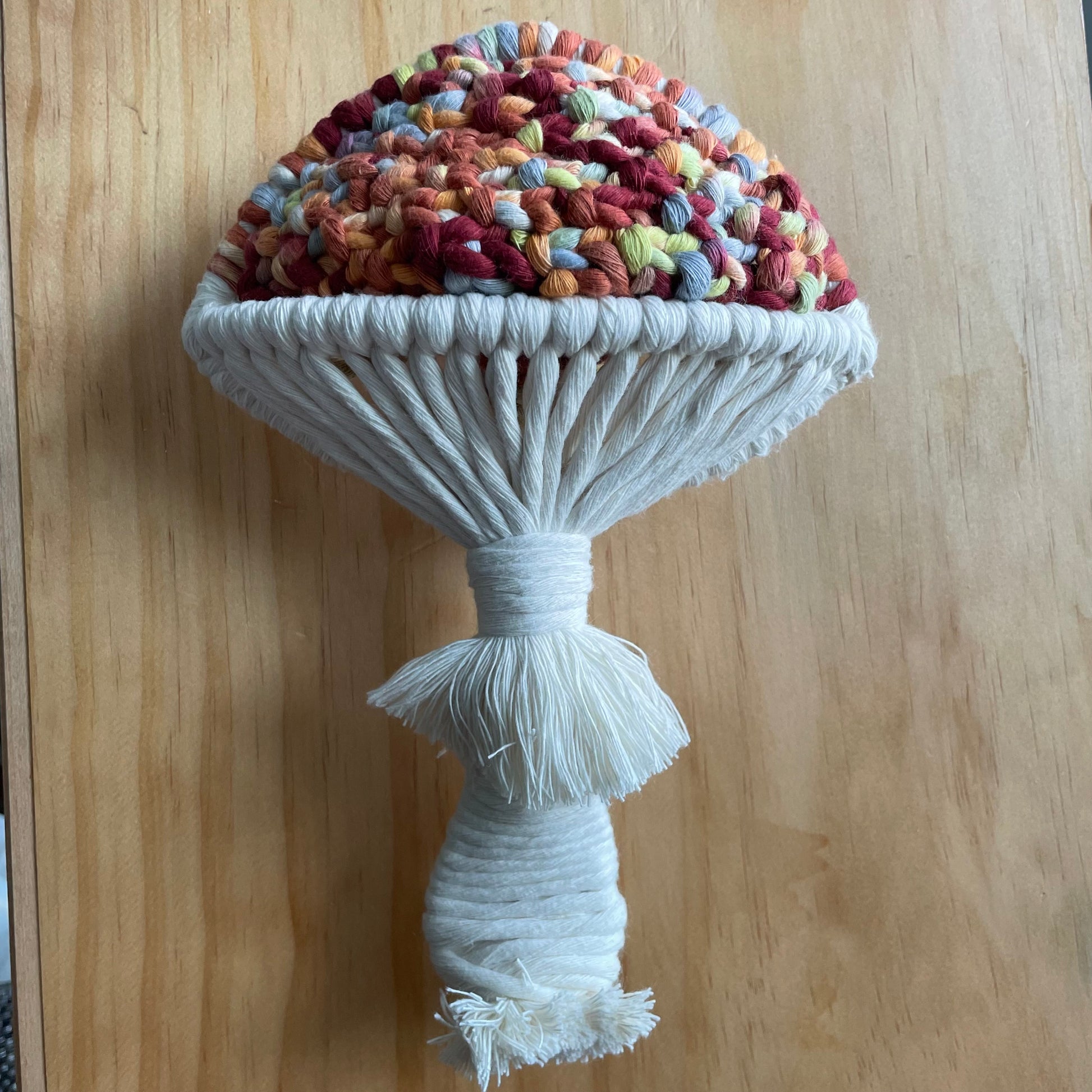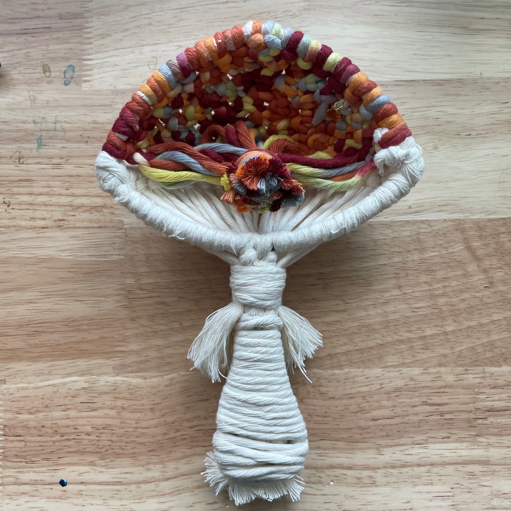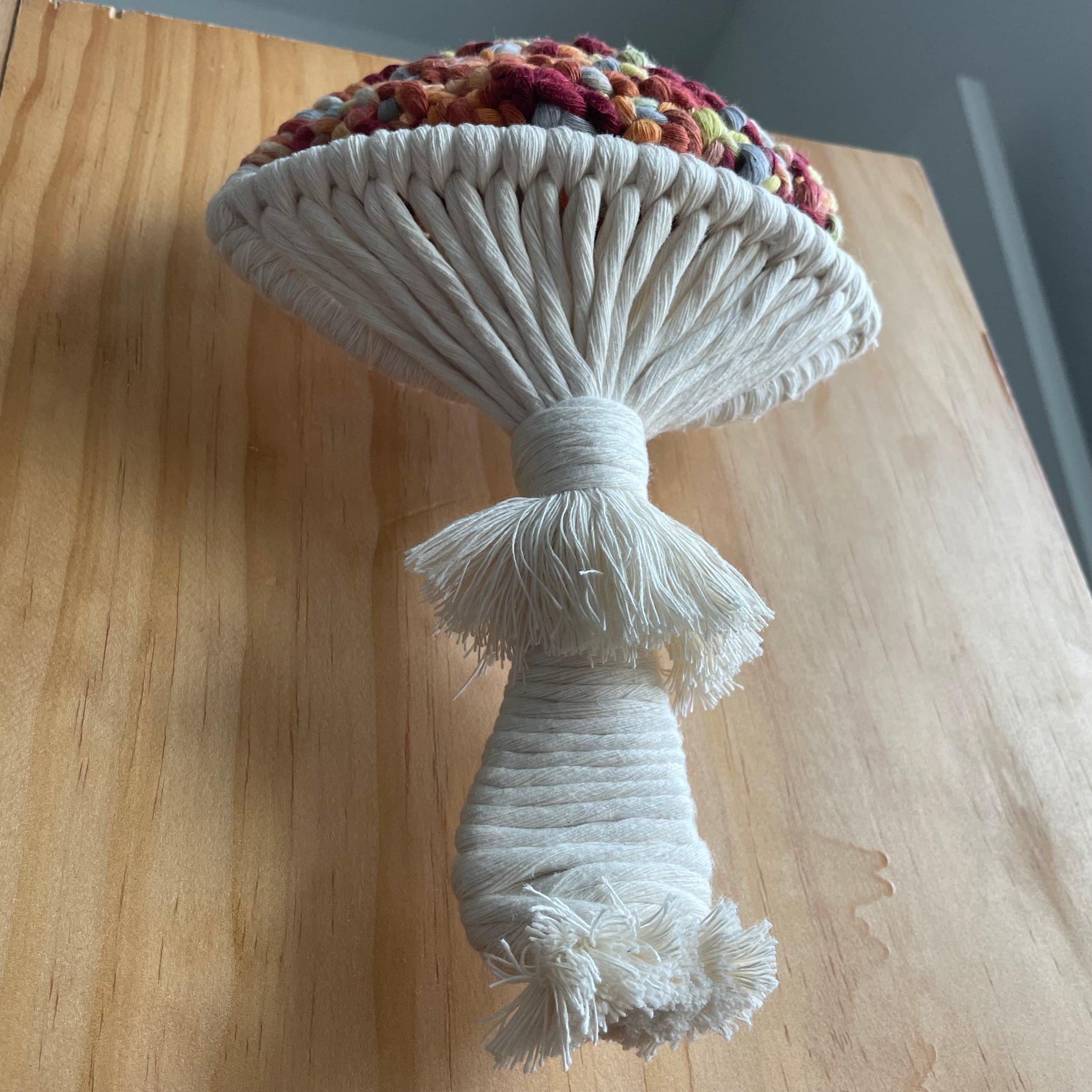 Get ready to add some fungus fun to your decor with this 100% recycled cotton macrame mushroom. A one-of-a-kind piece for the whimsical nature lover.