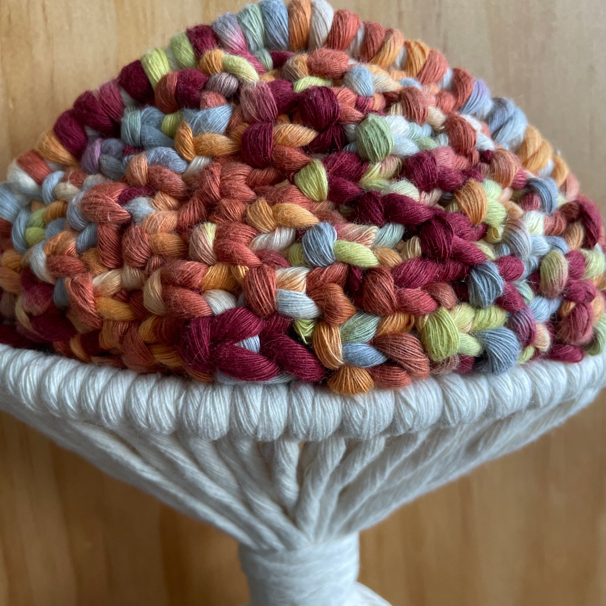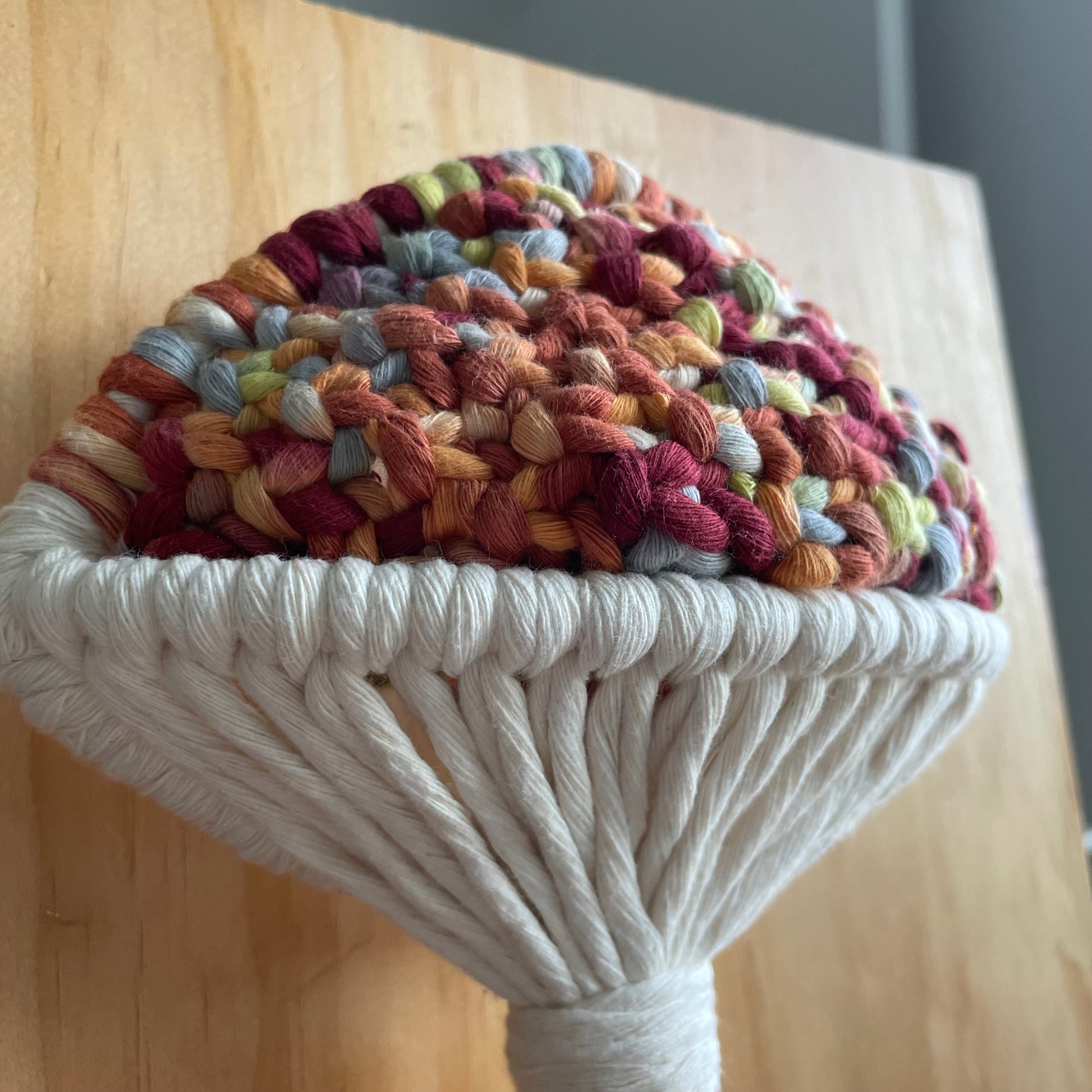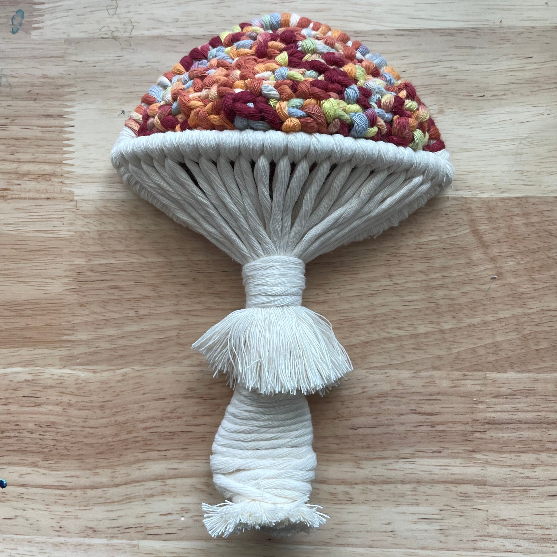 Get ready to add some fungus fun to your decor with this 100% recycled cotton macrame mushroom. A one-of-a-kind piece for the whimsical nature lover.