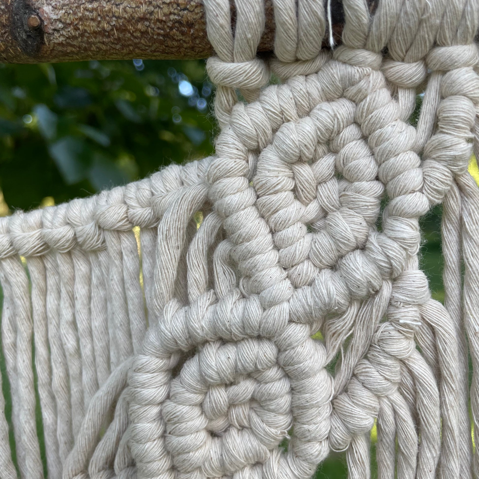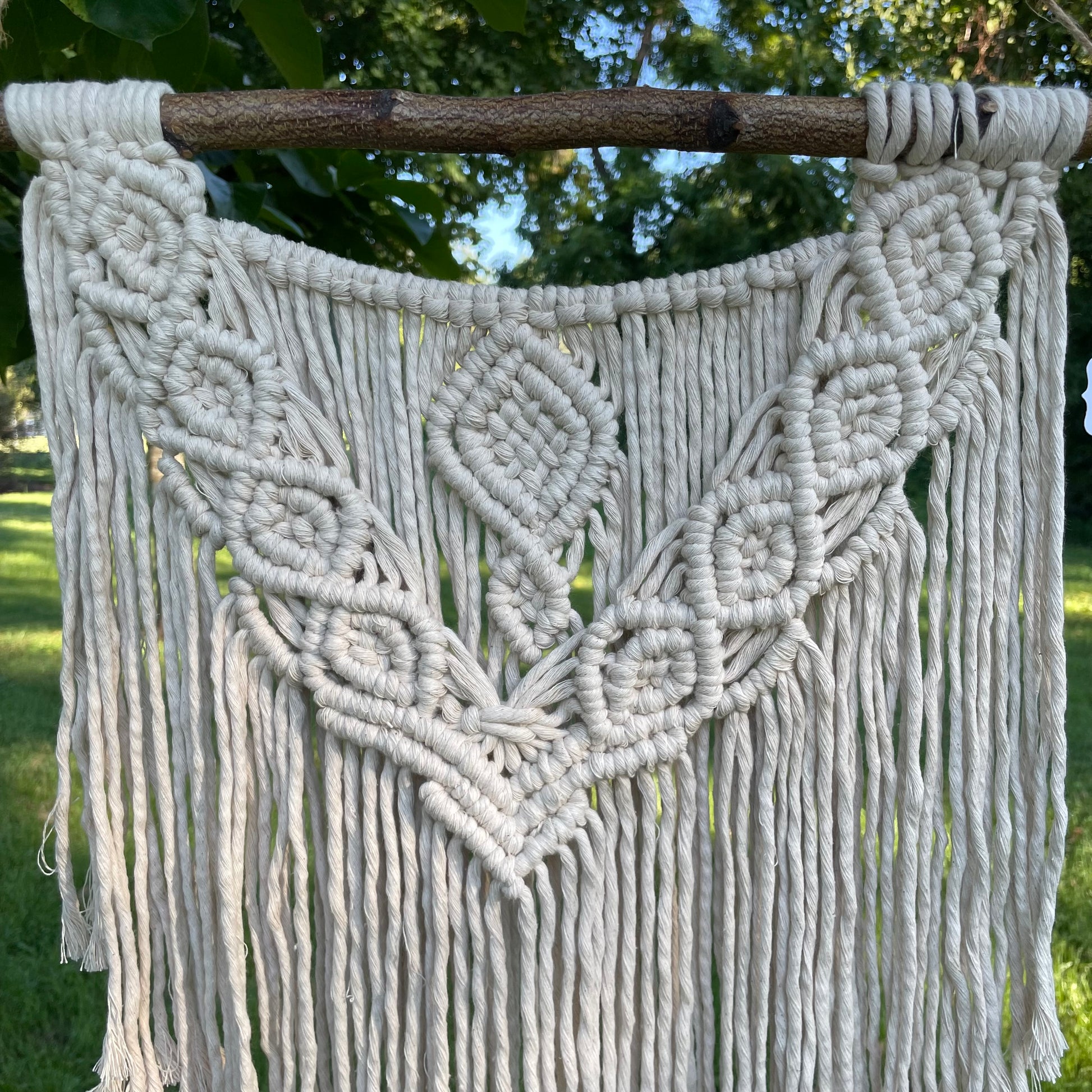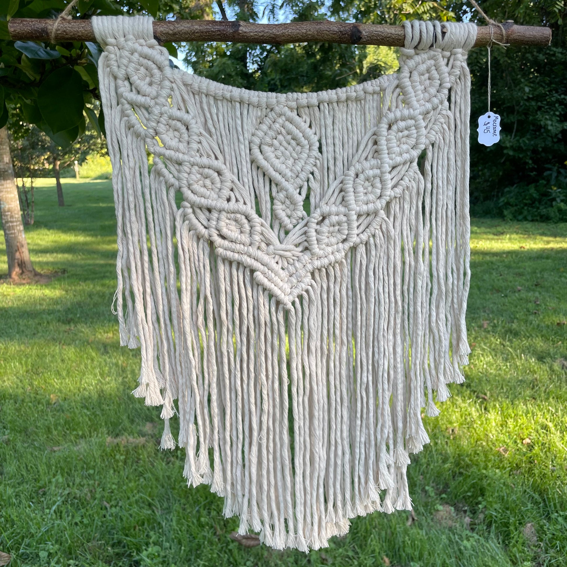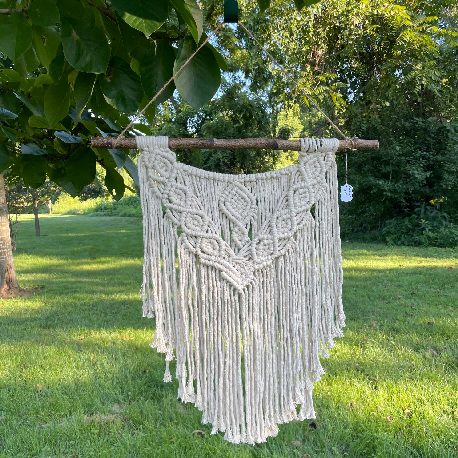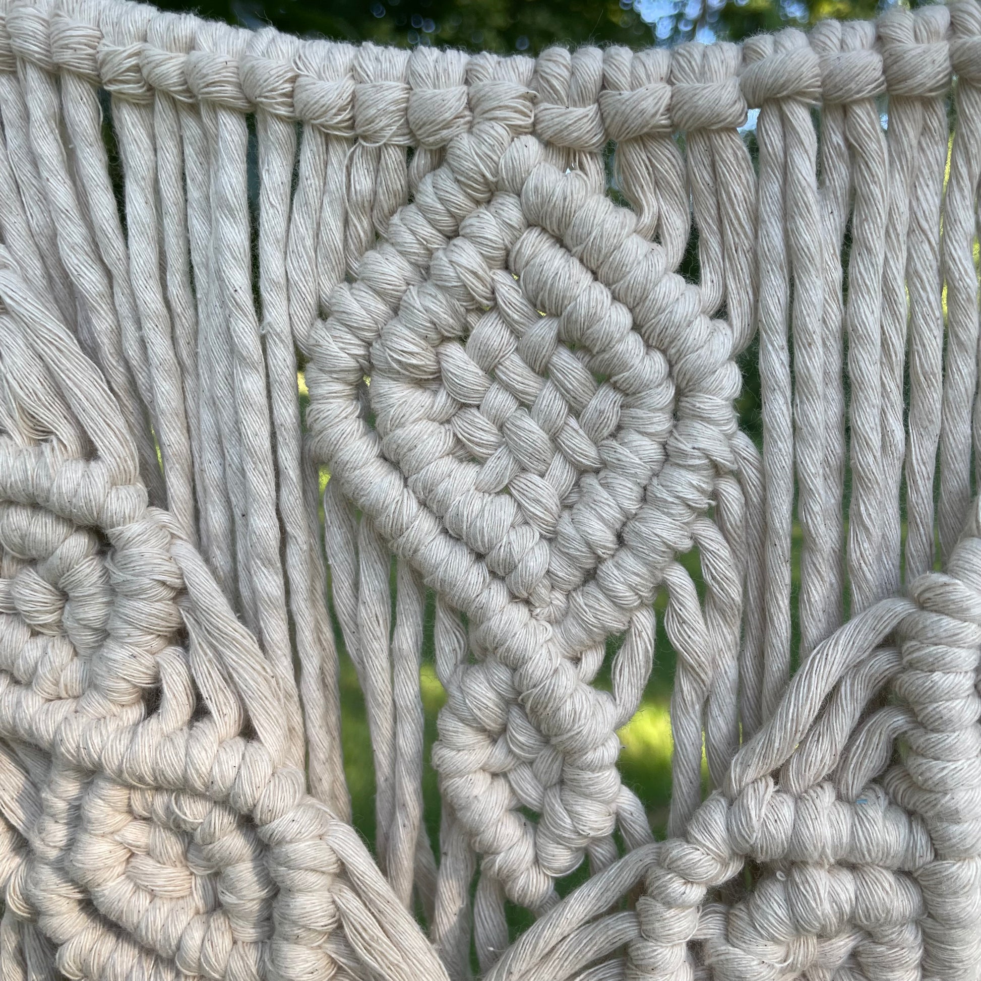 Get ready to add some boho-vibes to your living room or bedroom with our medium sized macrame wall hanging! Each knot was artfully hand-tied using soft, recycled cotton cord. It's time to make a statement with this unique and handmade decor piece that measures a perfect 20.5 inches wide and 30 inches long.
