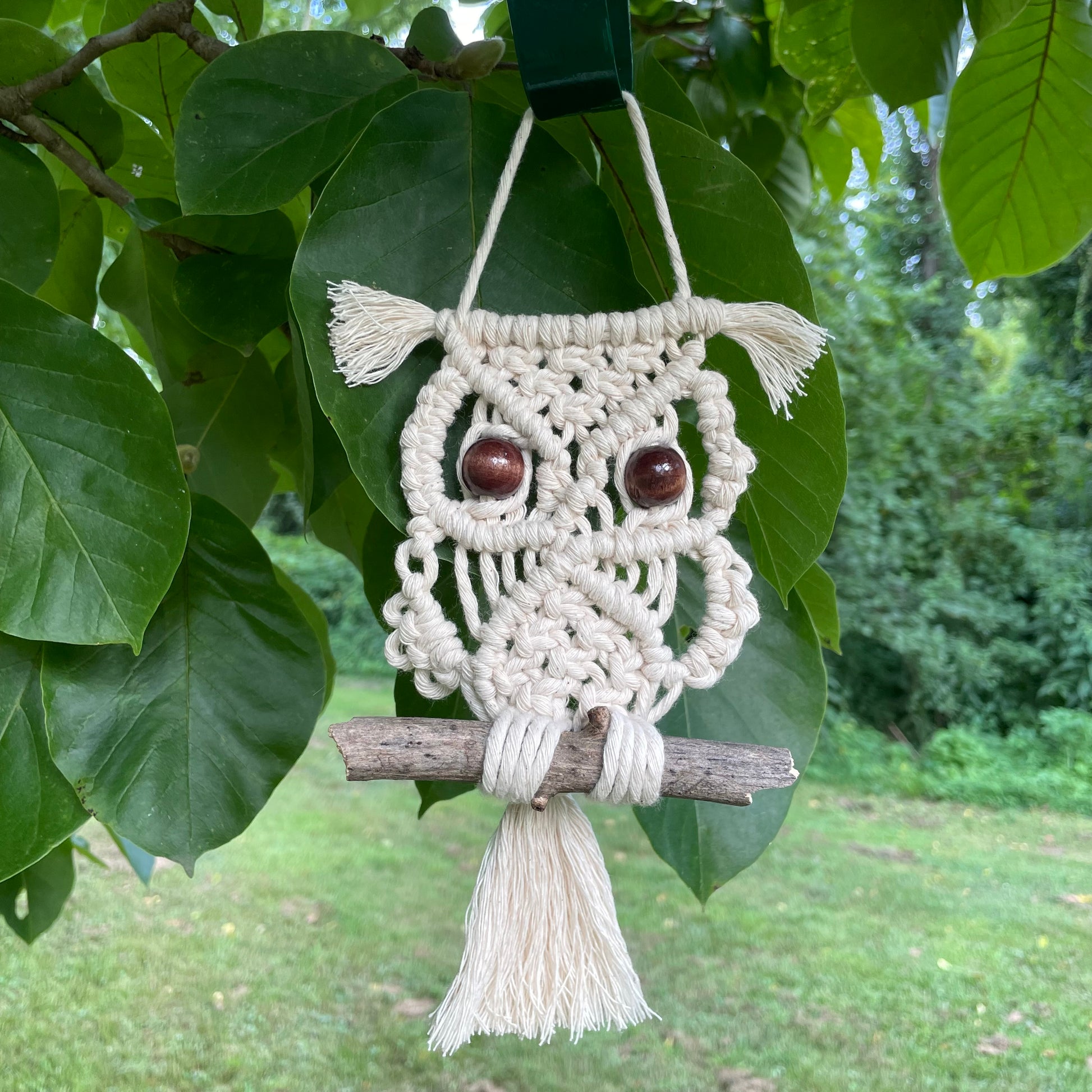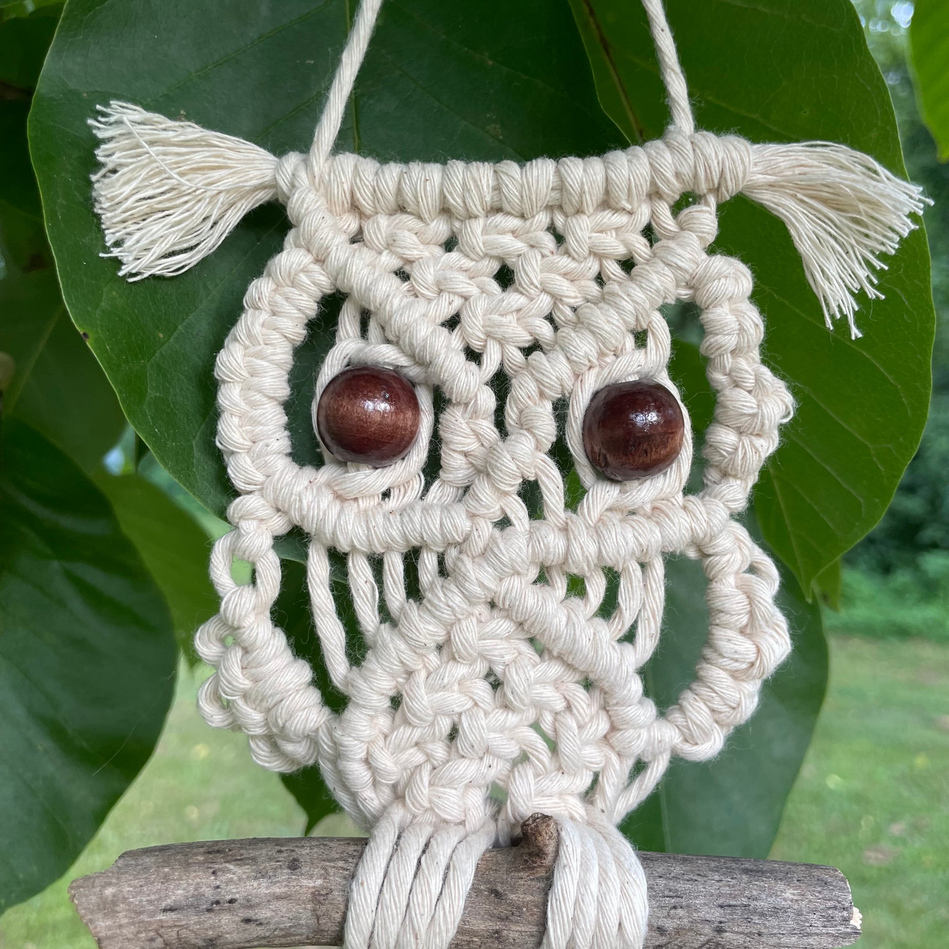 Made with love and care, this small macrame owl is perfect for any owl enthusiast! (Plus, hand-tied knots make it extra special.) It's a unique addition to any home and the perfect gift for your quirky, owl-obsessed friends. And, as always, feel free to message me with any questions about this adorable wall hanger. (Please note: eye color may vary.)