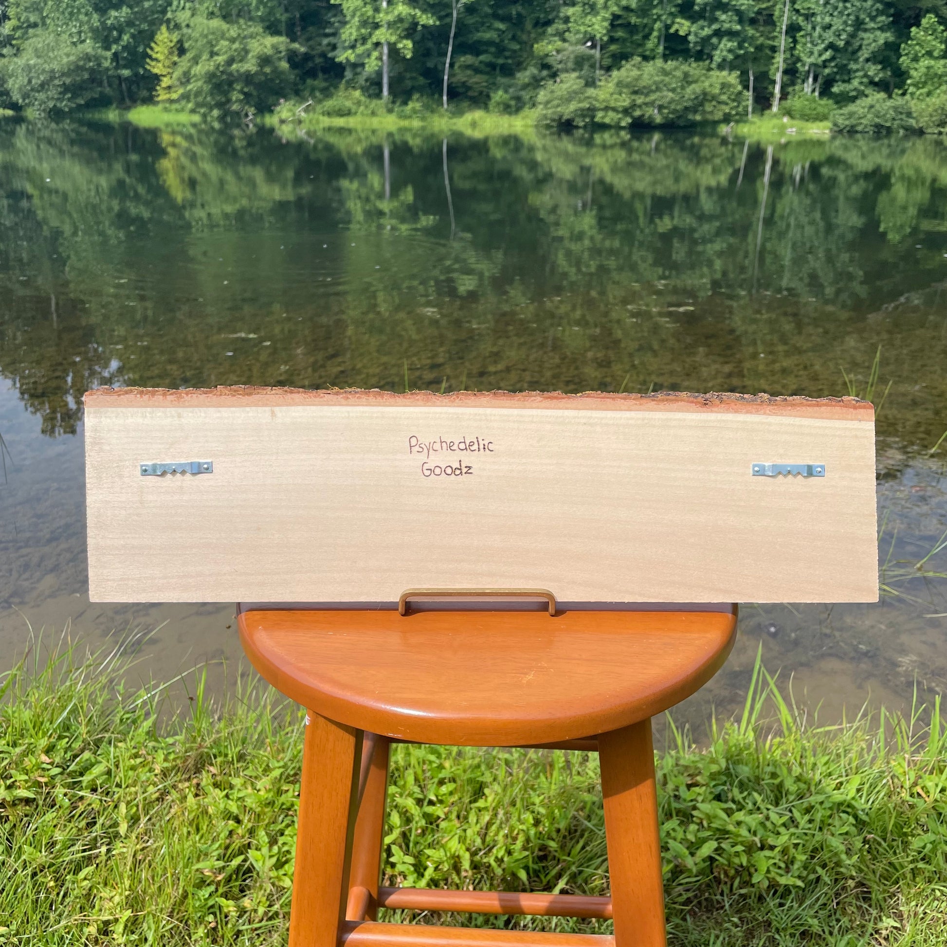 I use a hot wire pen to burn this image onto the wood slice. No laser printers here! Rest assured that hard work and love was put into your piece. I actually have a video of me burning this piece on my Instagram if you would like to check it out (Instagram.com/PsychedelicGoodz)! I use a shader tip to mimic the brush strokes of a paint brush. The process is slow, but so relaxing. I finished the piece with a high gloss polyacrylic finish to seal the wood. This will protect the piece from general wear and tear, but it will not protect it from water, sun exposure, or dropping.