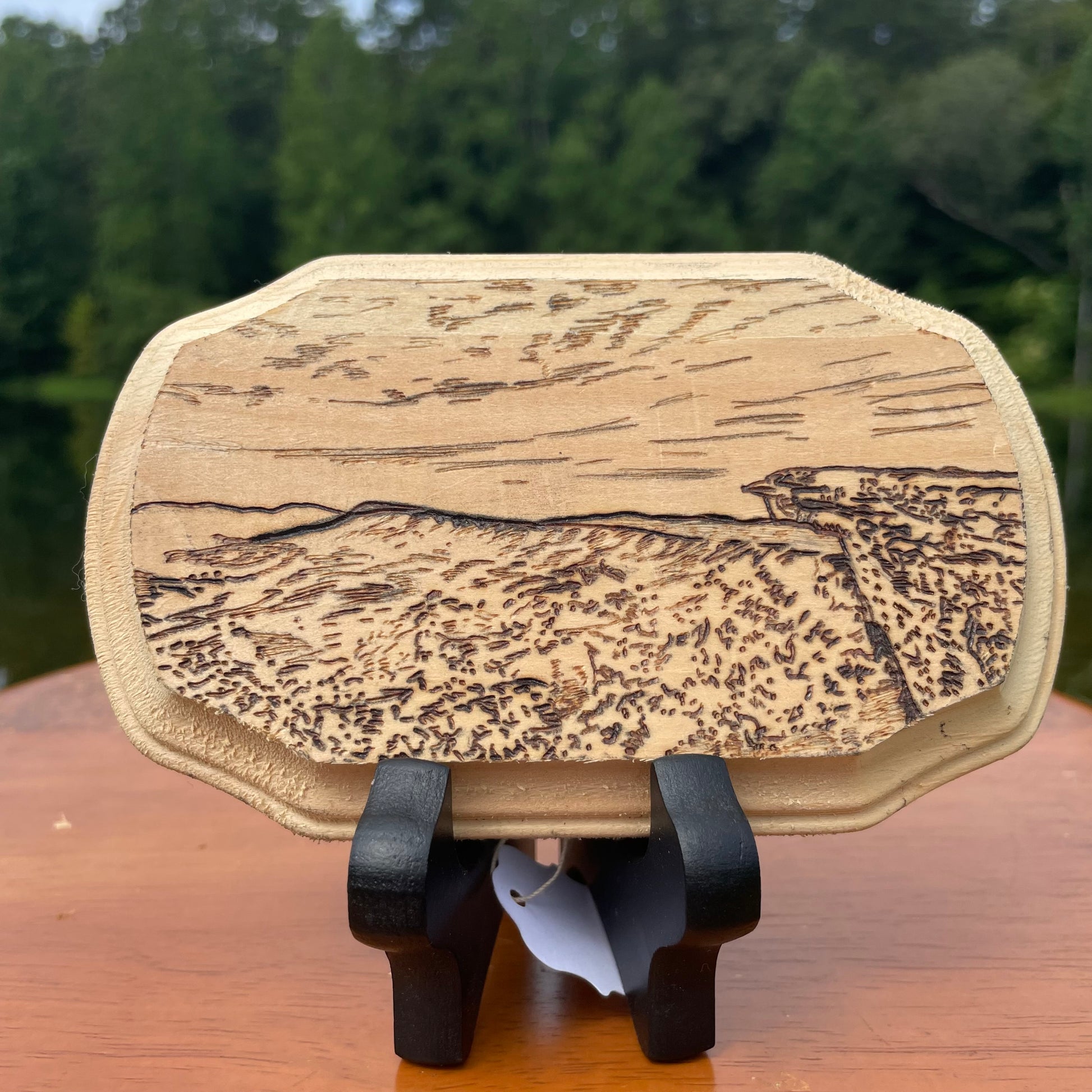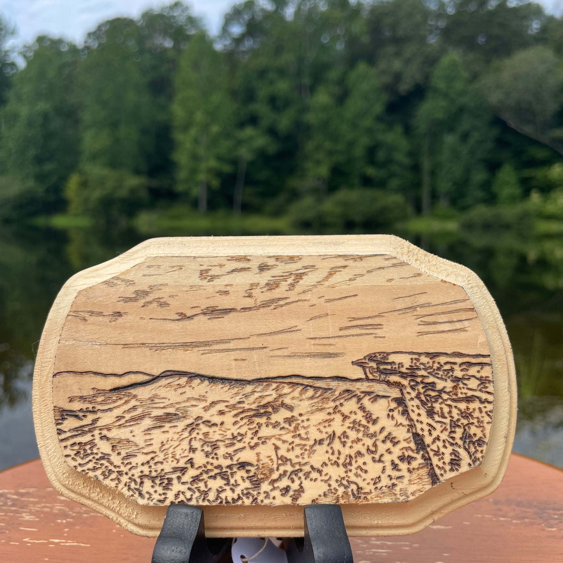 This is one of the first pieces I ever burned. It is a view of McAfee Knob located in Virginia. It looks great on an easel! There is not a hanger on the back. Please reach out if you would like me to attach one.