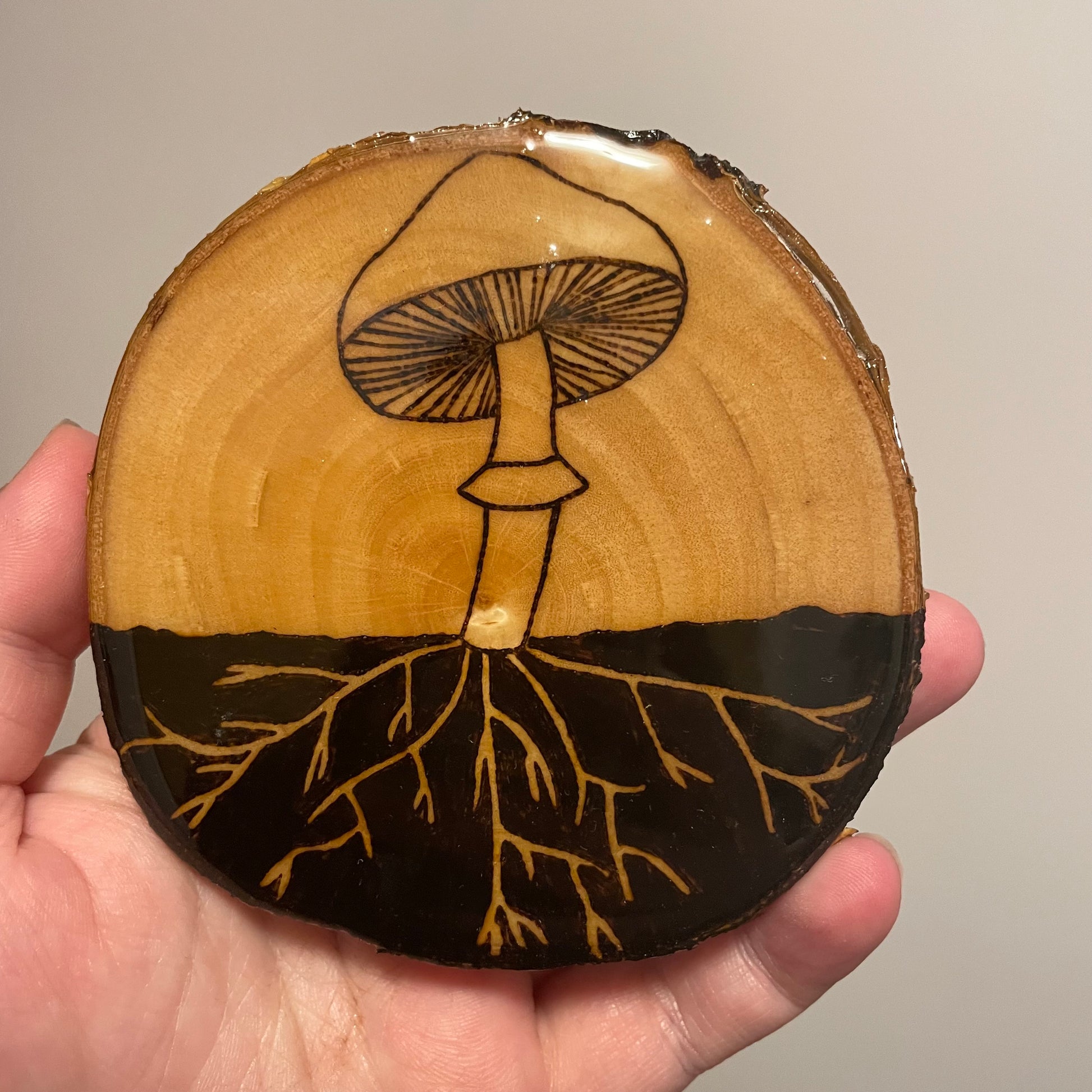 This wood burned coaster features a mushroom with mychorizae. It is heat resistant and waterproof. It has a mirror-like finish and would look great on your side/coffee table! This is the perfect gift for any occasion especially for the eco conscious since it is made from natural material!