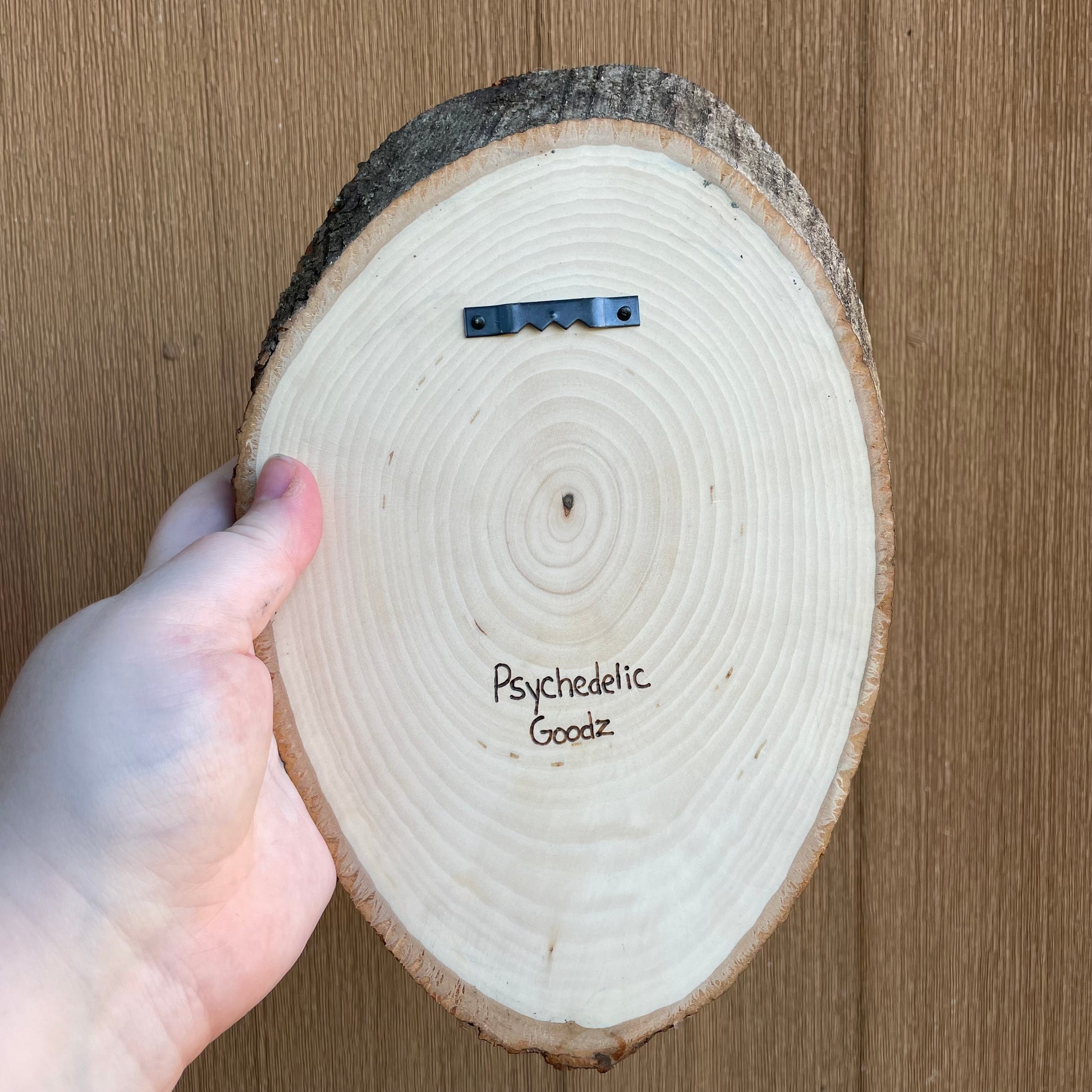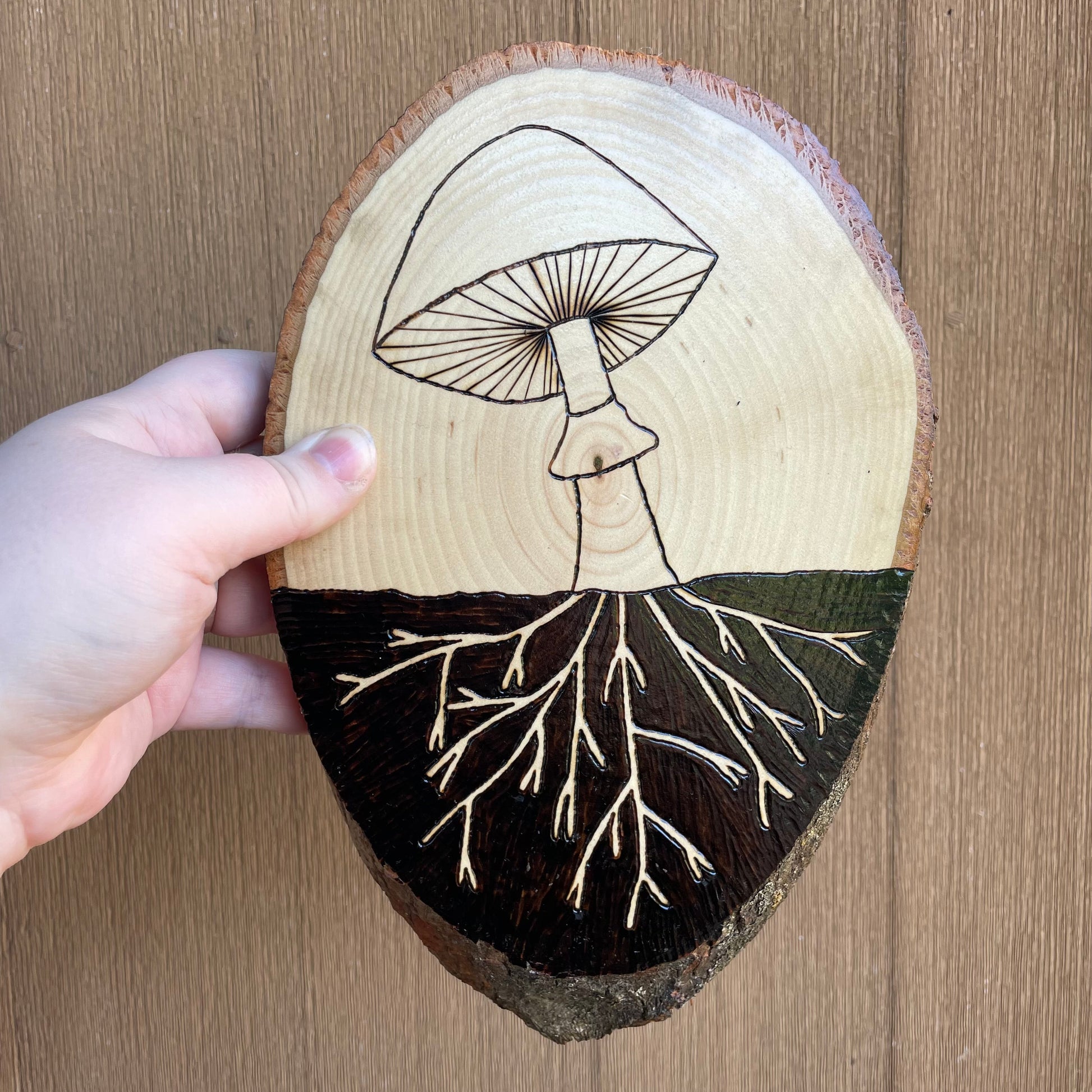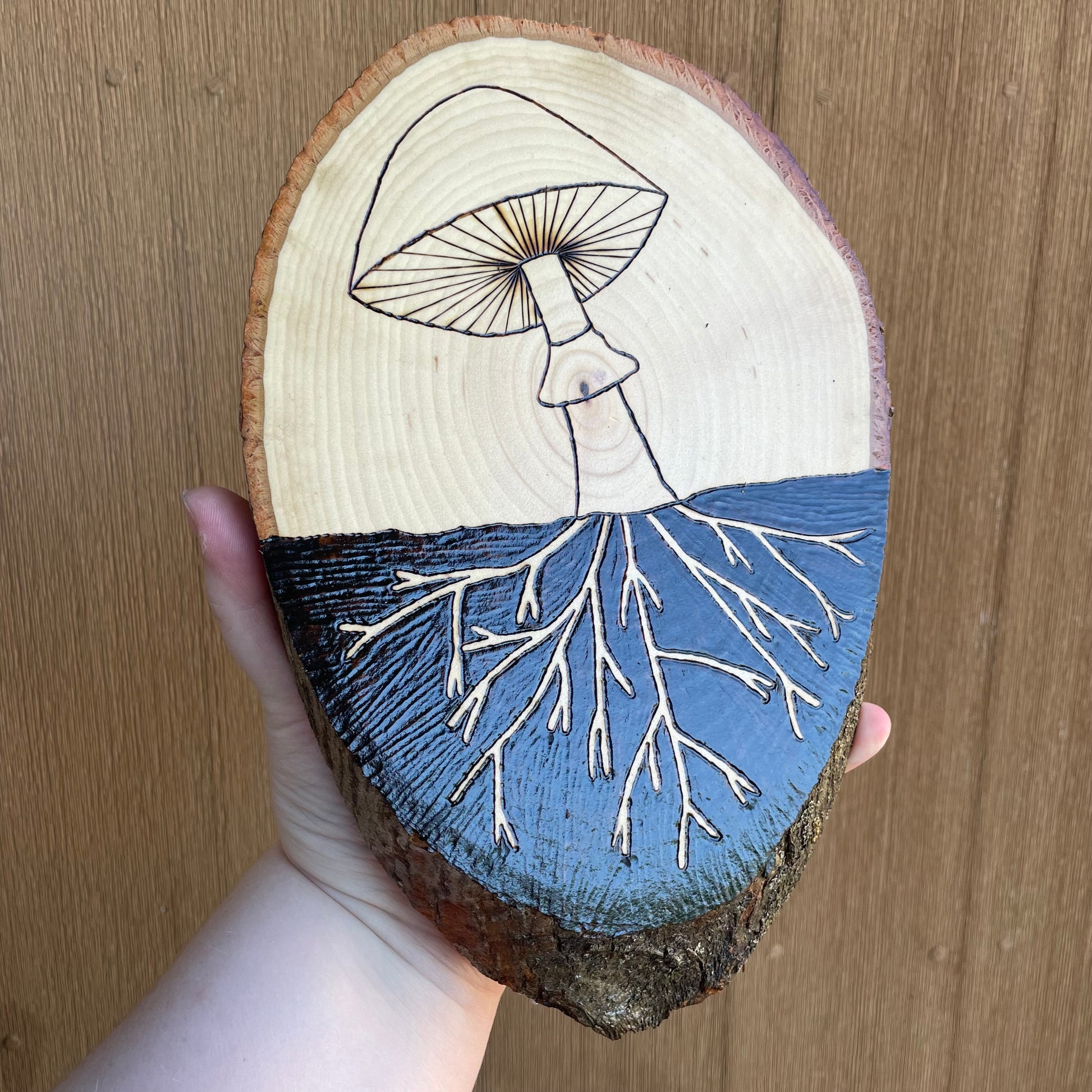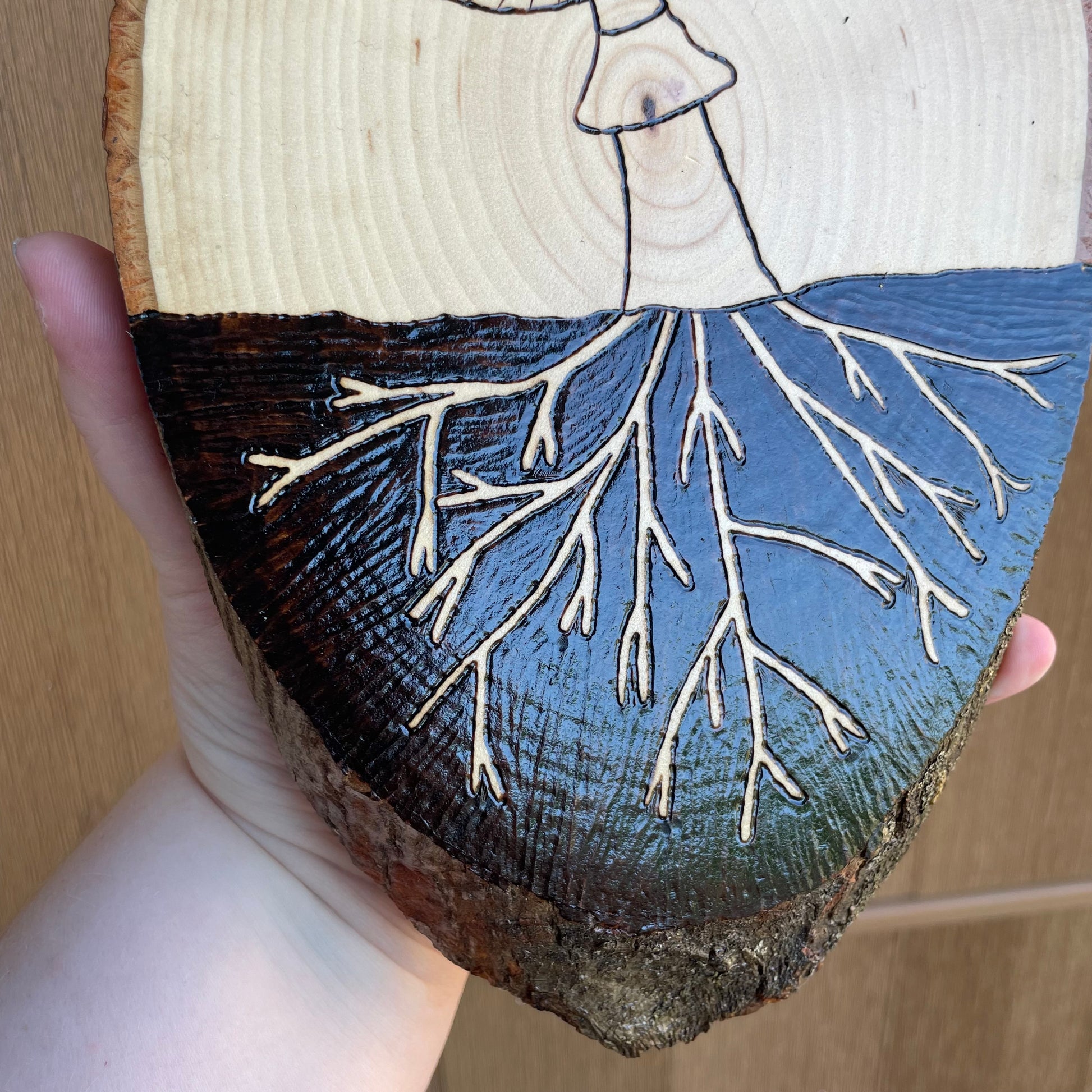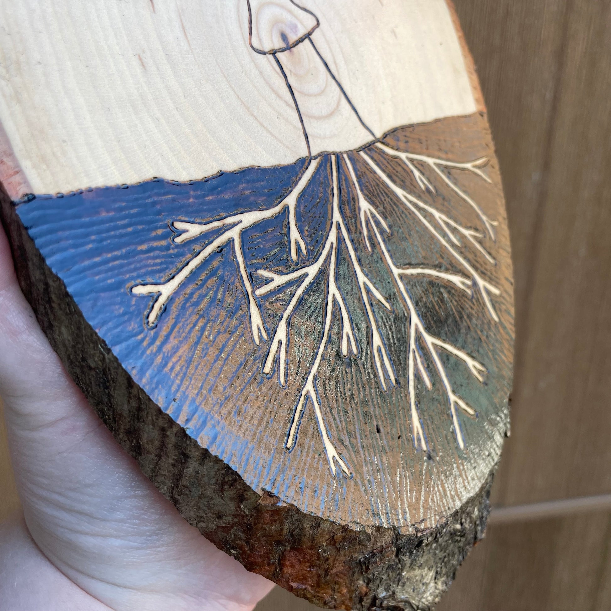I use a hot wire pen to burn this image onto the wood slice. No laser printers here! Rest assured that hard work and love was put into your piece. I use a high gloss polyacrylic finish to seal the wood. This will protect the piece from general wear and tear, but it will not protect it from water, sun exposure, or dropping. My favorite part to burn on this piece is the mycorrhizae. It is tedious and you have to be precise. I find beauty in the fine details and I believe that is what makes this piece so unique.