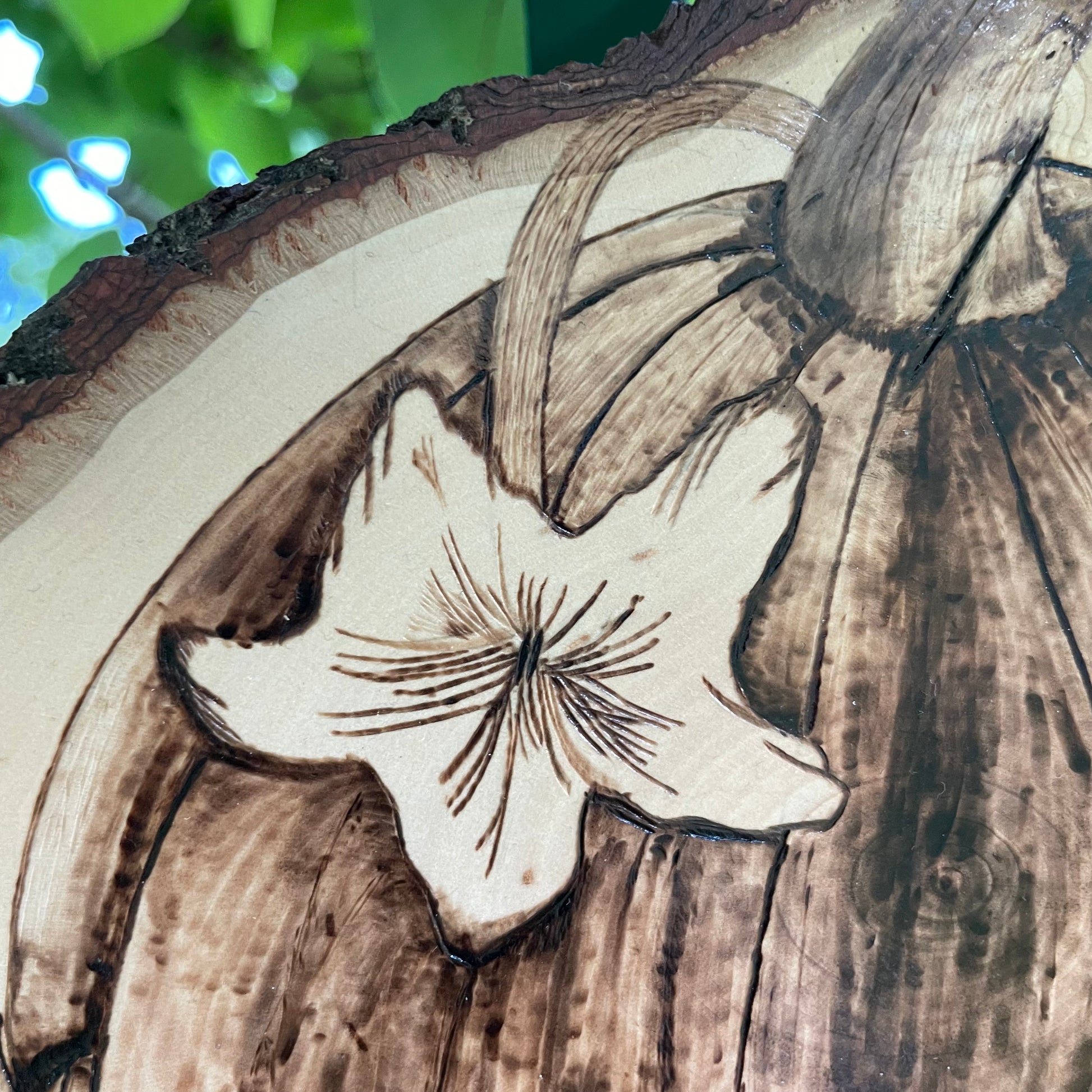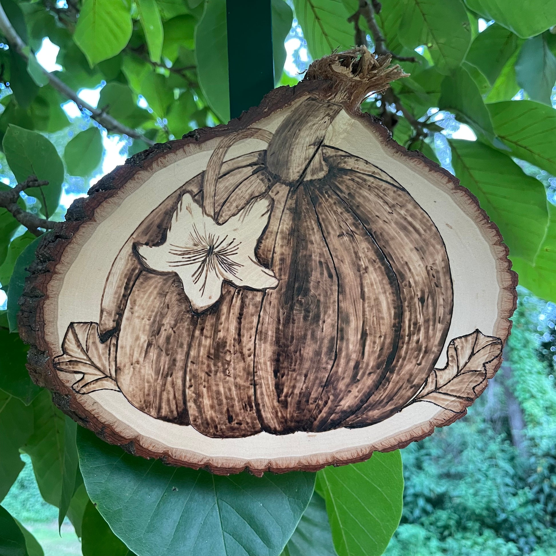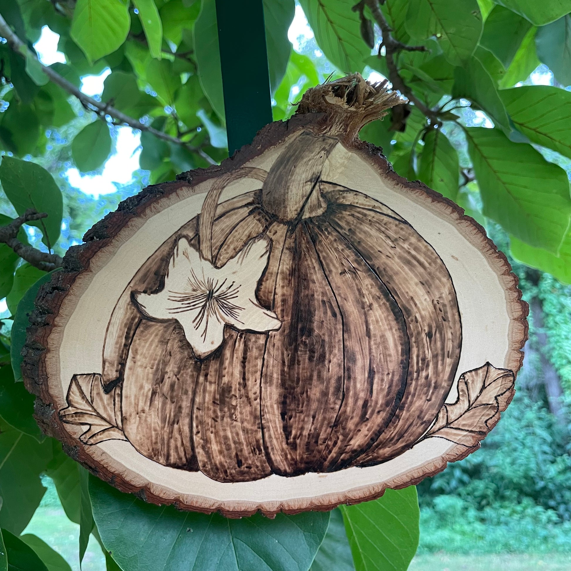 Take fall decor to the next level with this unique hand-burned wood slice featuring a beautiful pumpkin design. It's the perfect gift for the eco-conscious (or anyone who loves quirky and natural decor), or snag one for yourself and enjoy the beauty of autumn all season long!