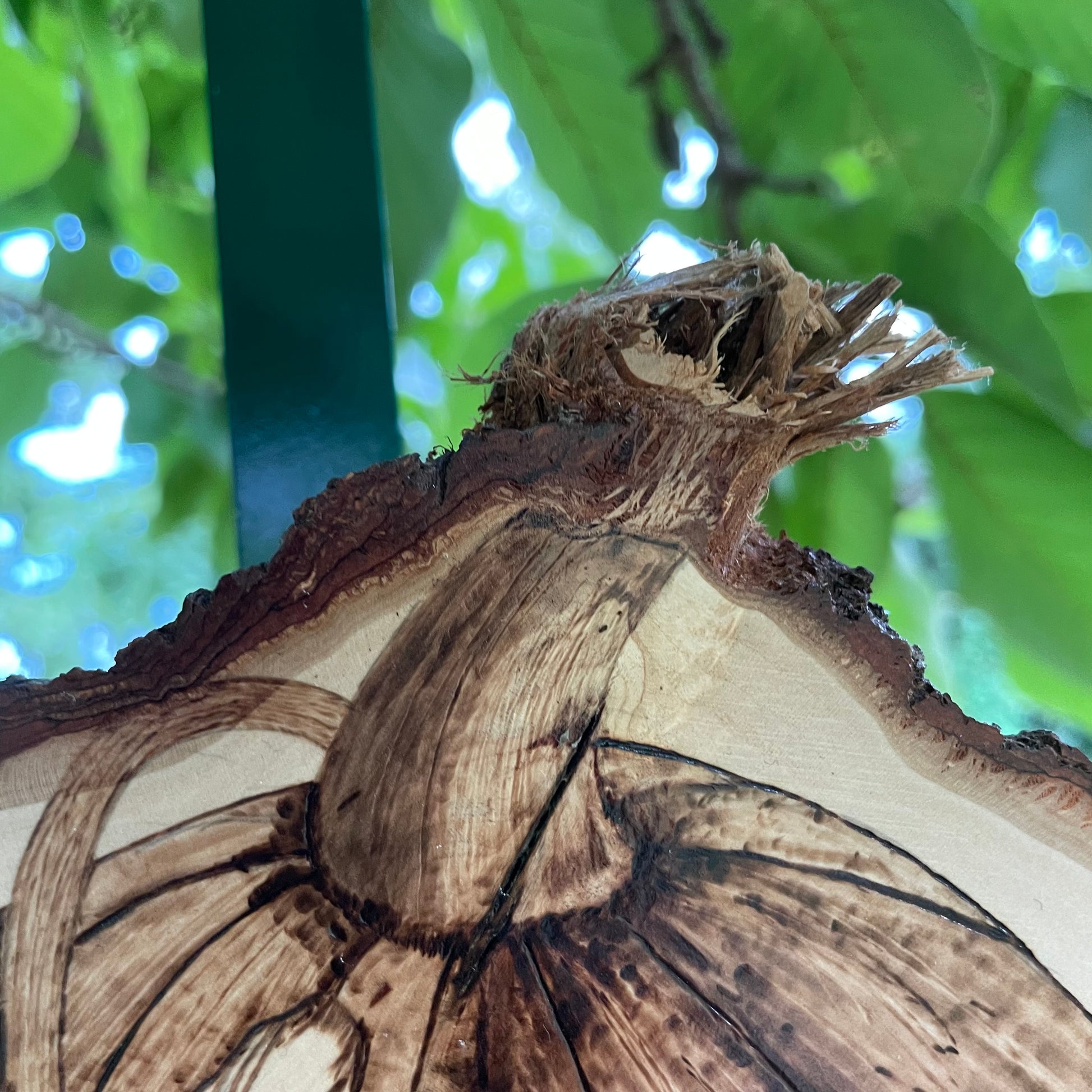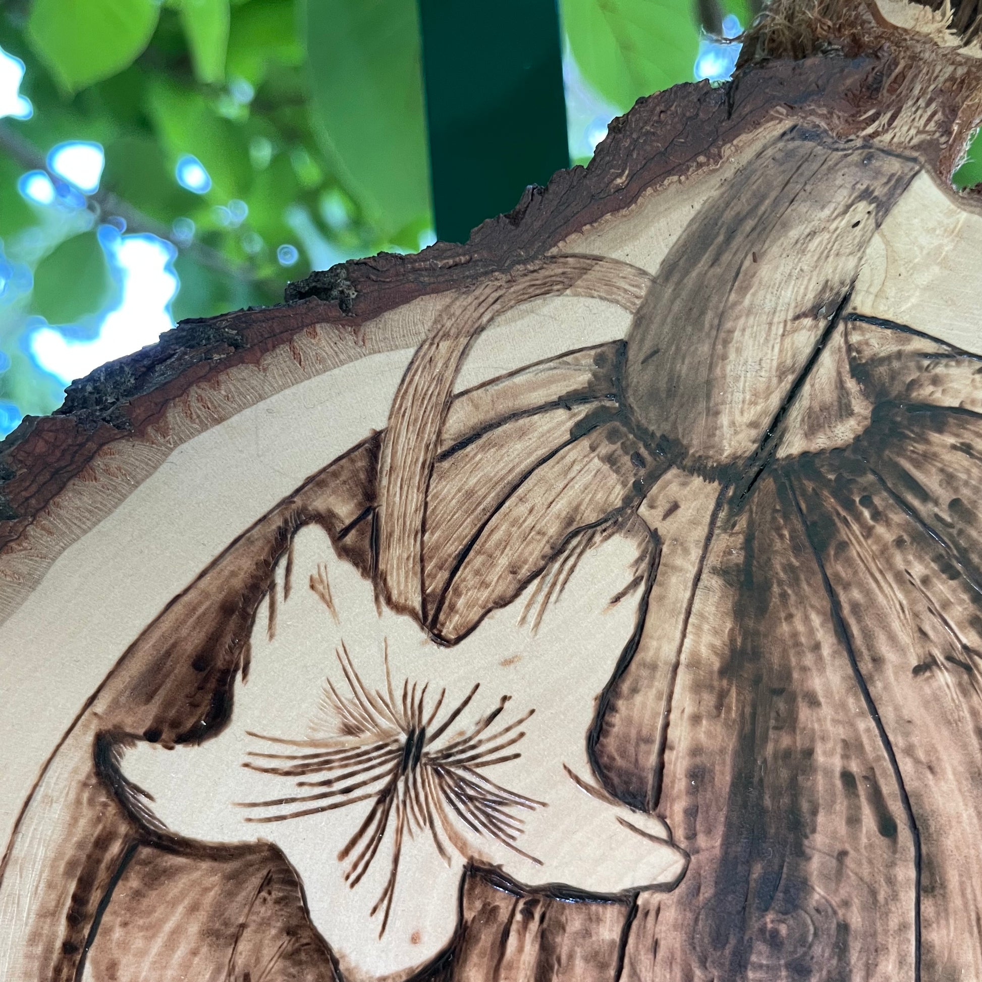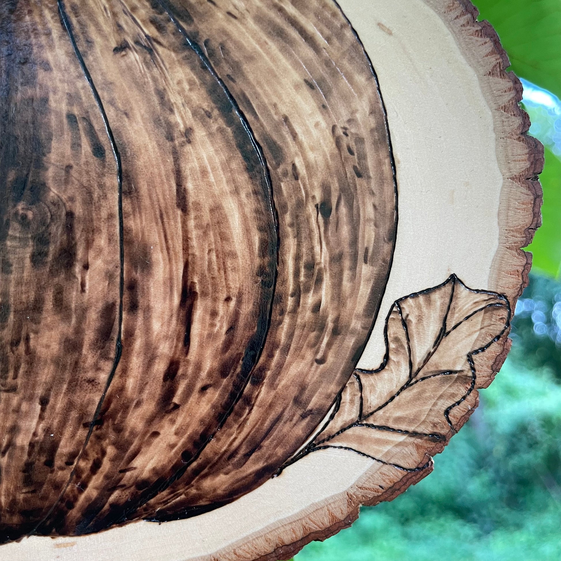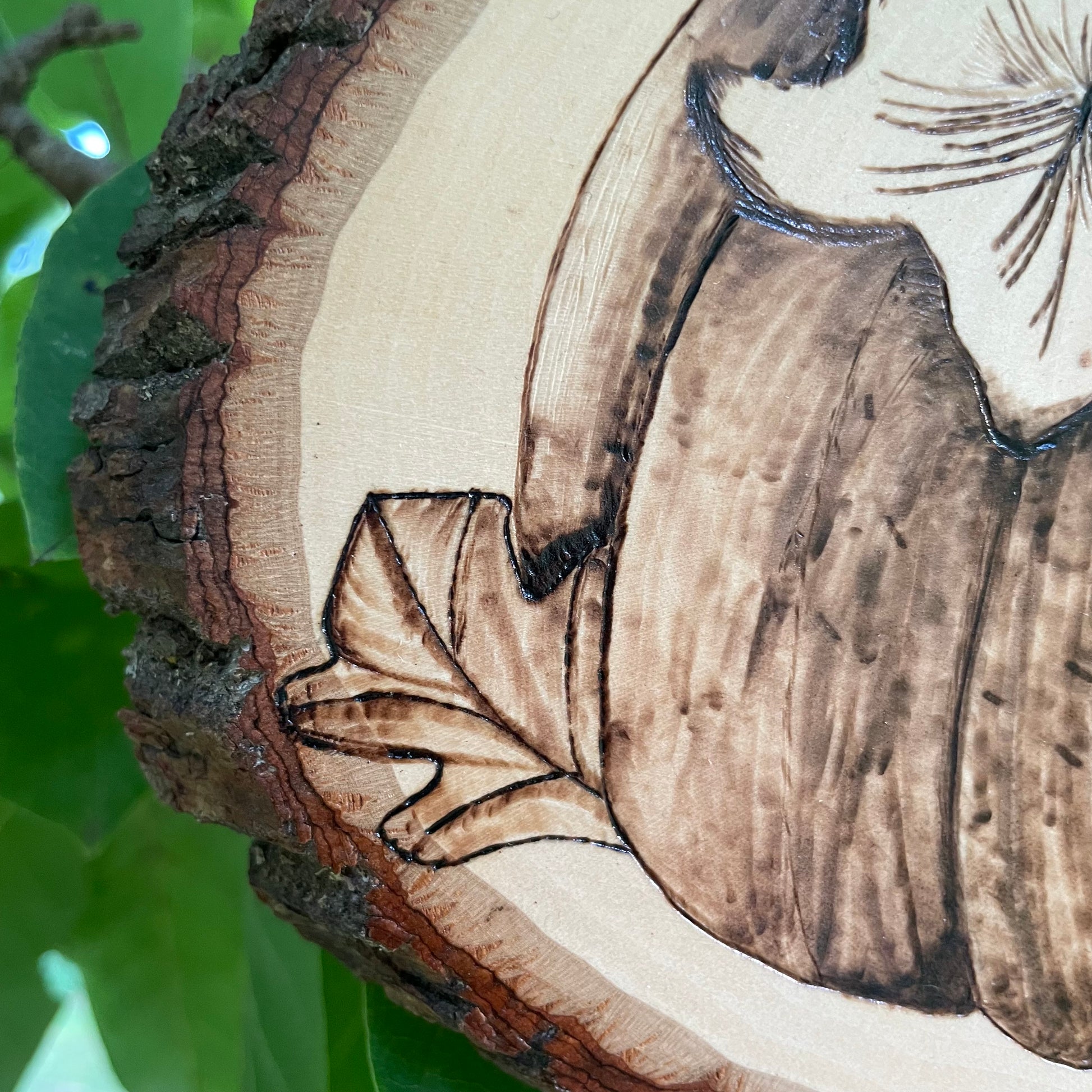 I use a hot wire pen to burn this image onto the wood slice. No laser printers here! Rest assured that hard work and love was put into your piece. Once I’m done, I use a high gloss polyacrylic finish to seal the wood. This will protect the piece from general wear and tear, but it will not protect it from water, sun exposure, or dropping.