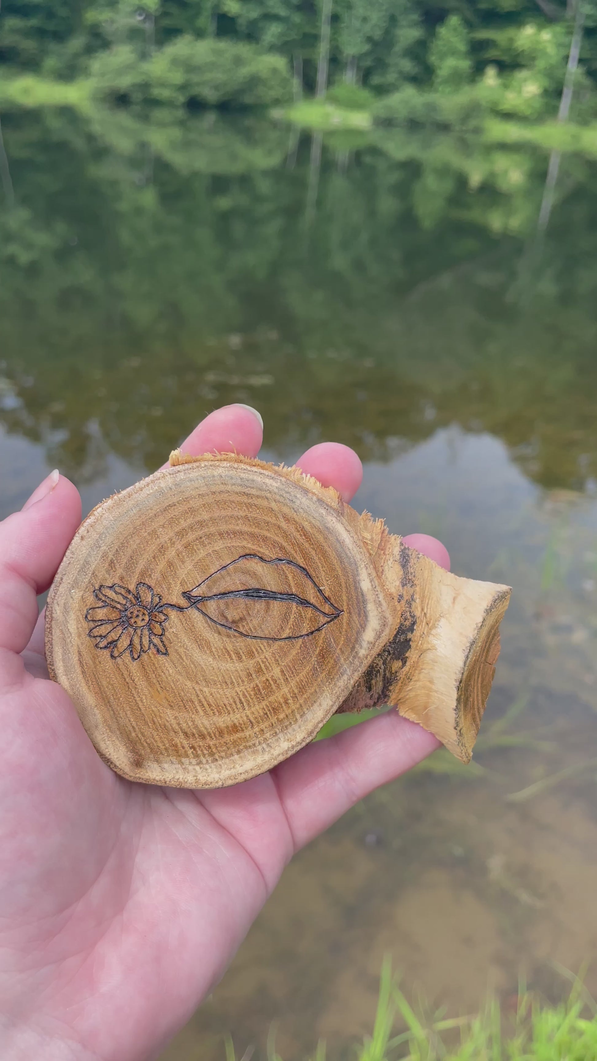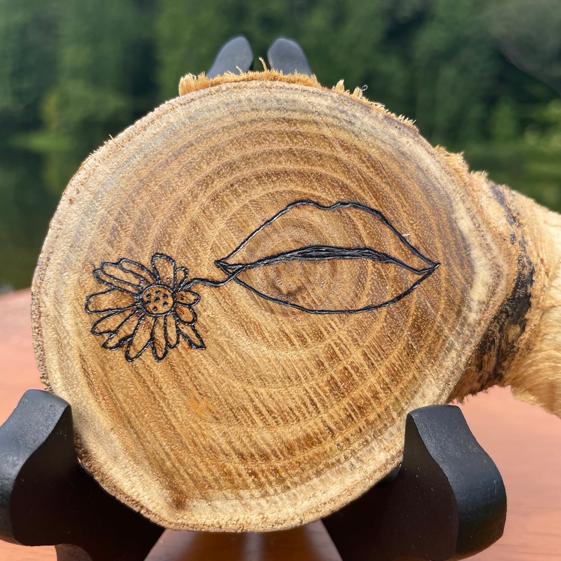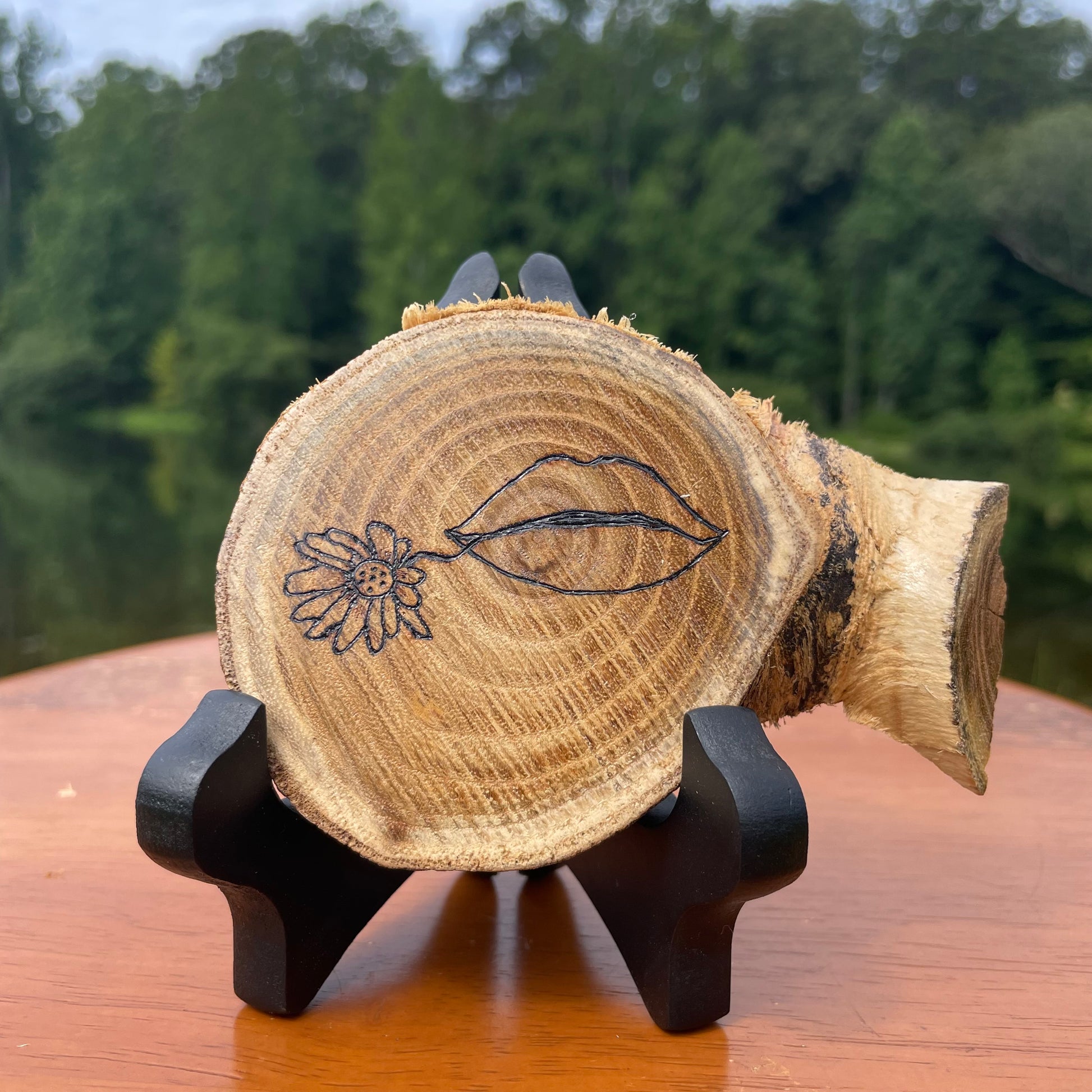 This natural live edge wood slice was burned by hand and features lips holding a dainty flower. I made this piece because I wanted to make something that symbolized love. I wanted to show what speaking love and kindness to others would look like. In life, we are often quick to judge and speak our opinions to others instead of listening. Maybe we could help those around us by just being there and listening to them? Maybe we could build them up by speaking words of positivity? Try it today! I think you’ll be surprised how much we really need each other. This piece does not come with a hanger on the back. You will need to purchase an easel or reach out to me and I can attach a hanger on the back.