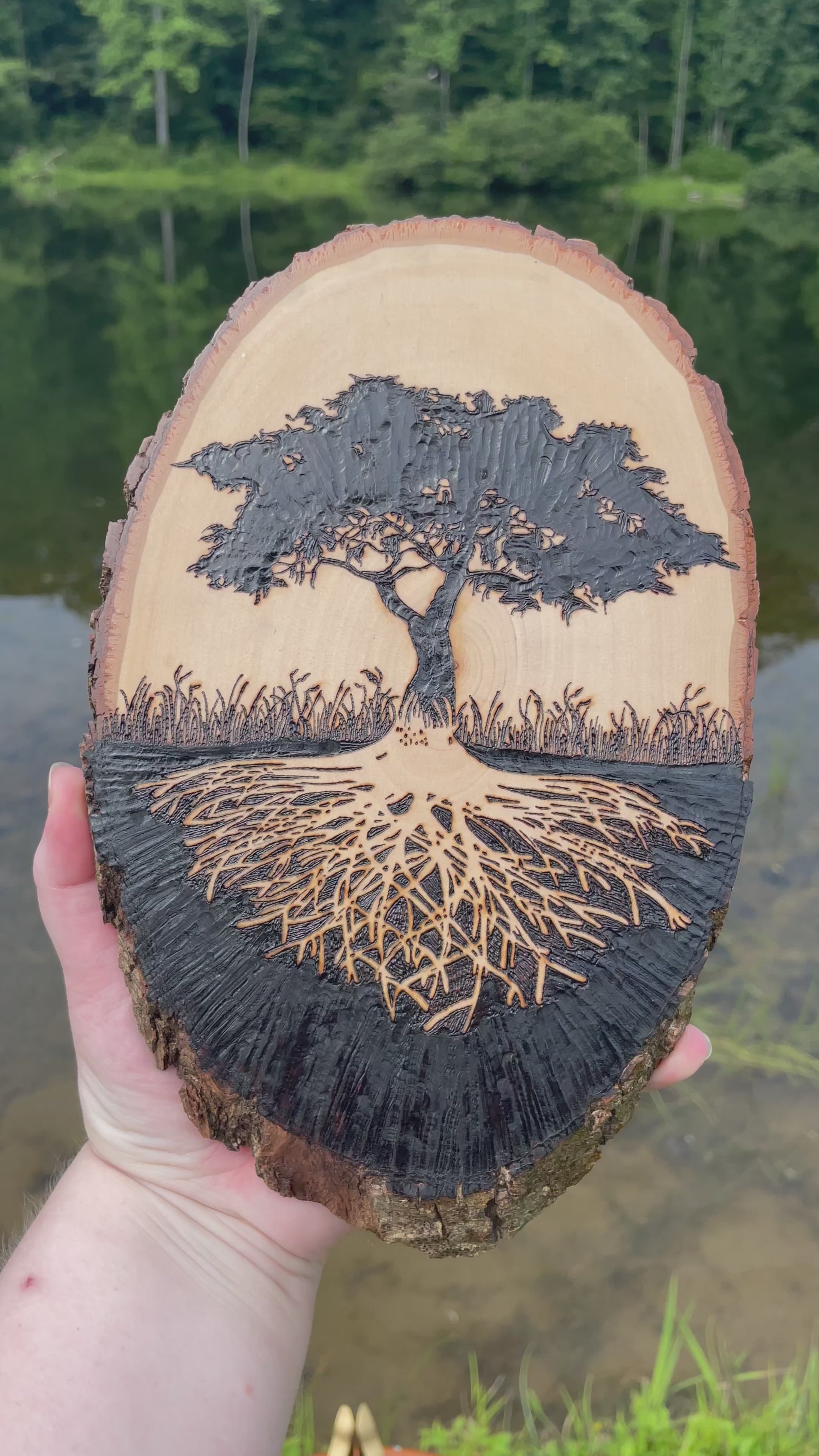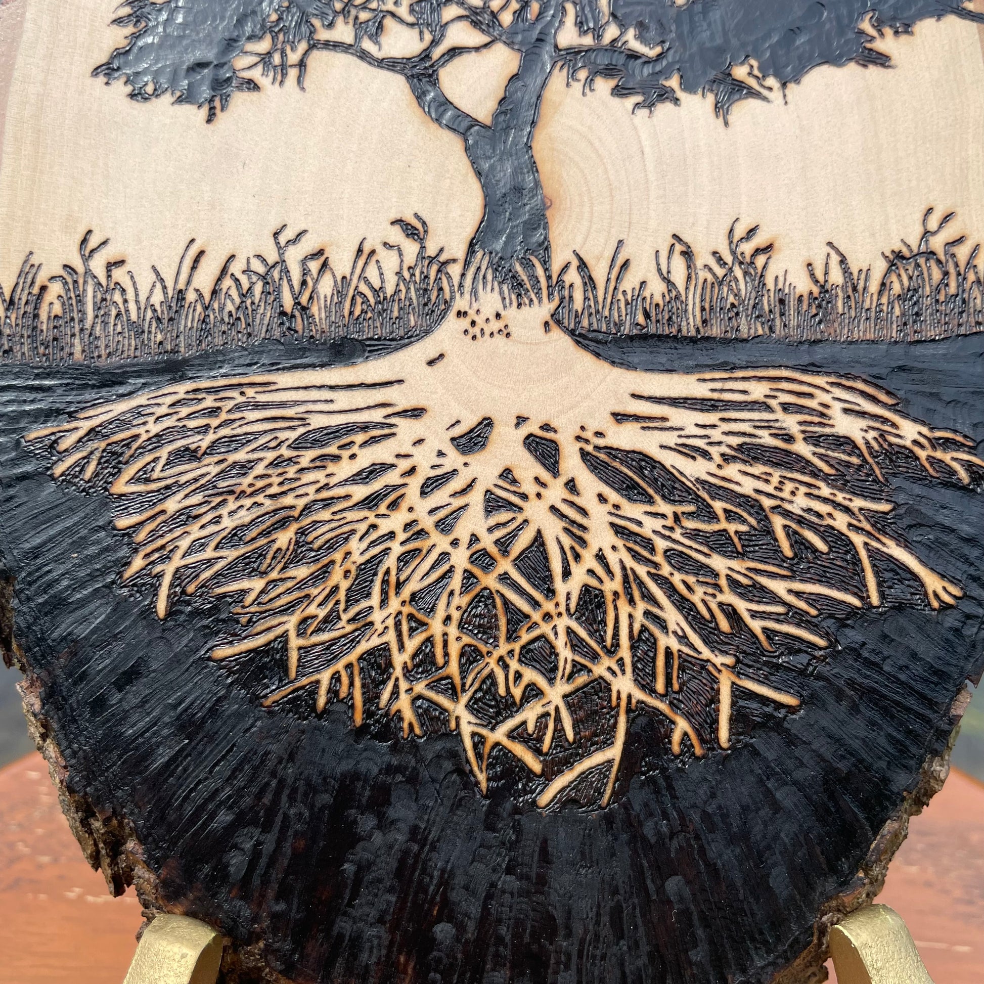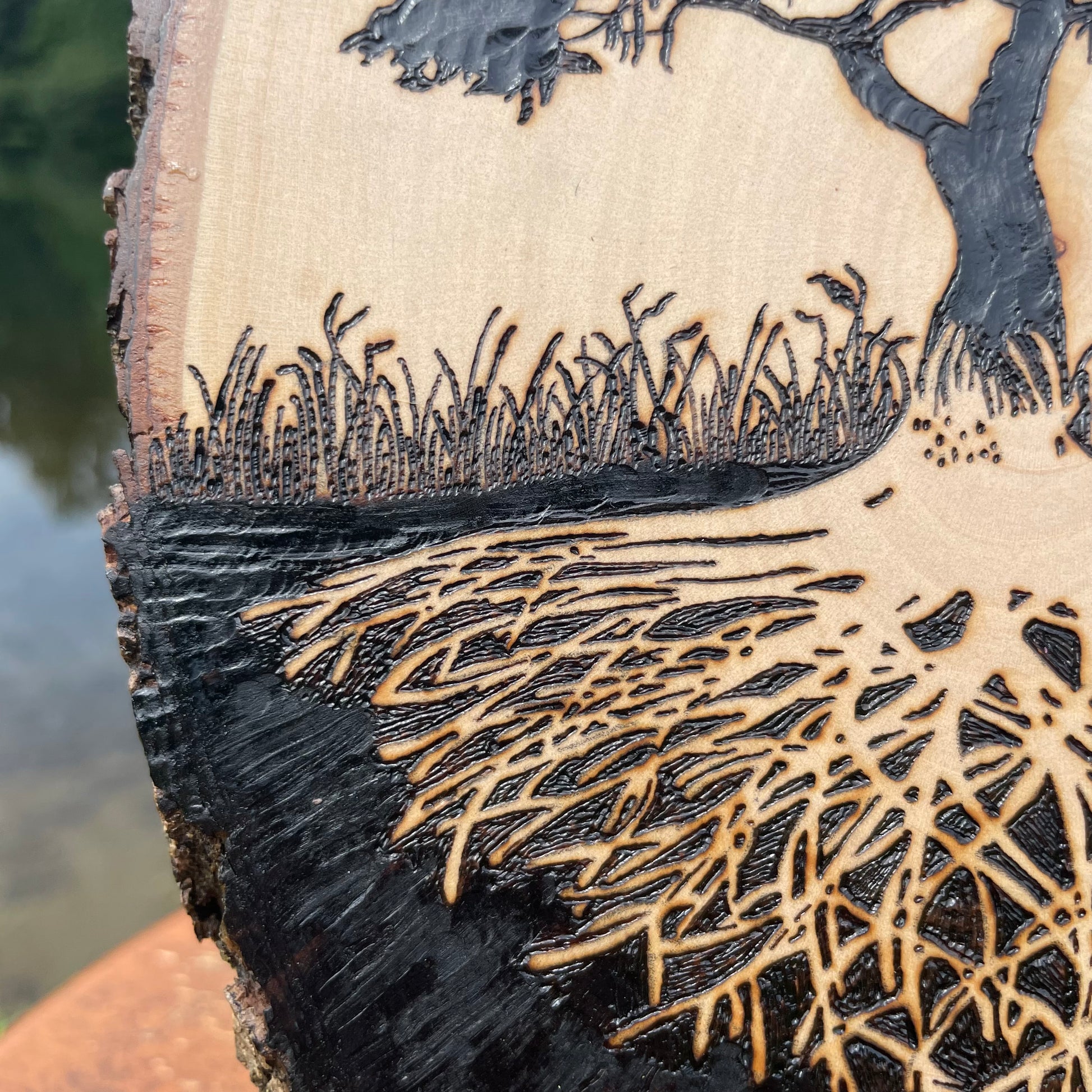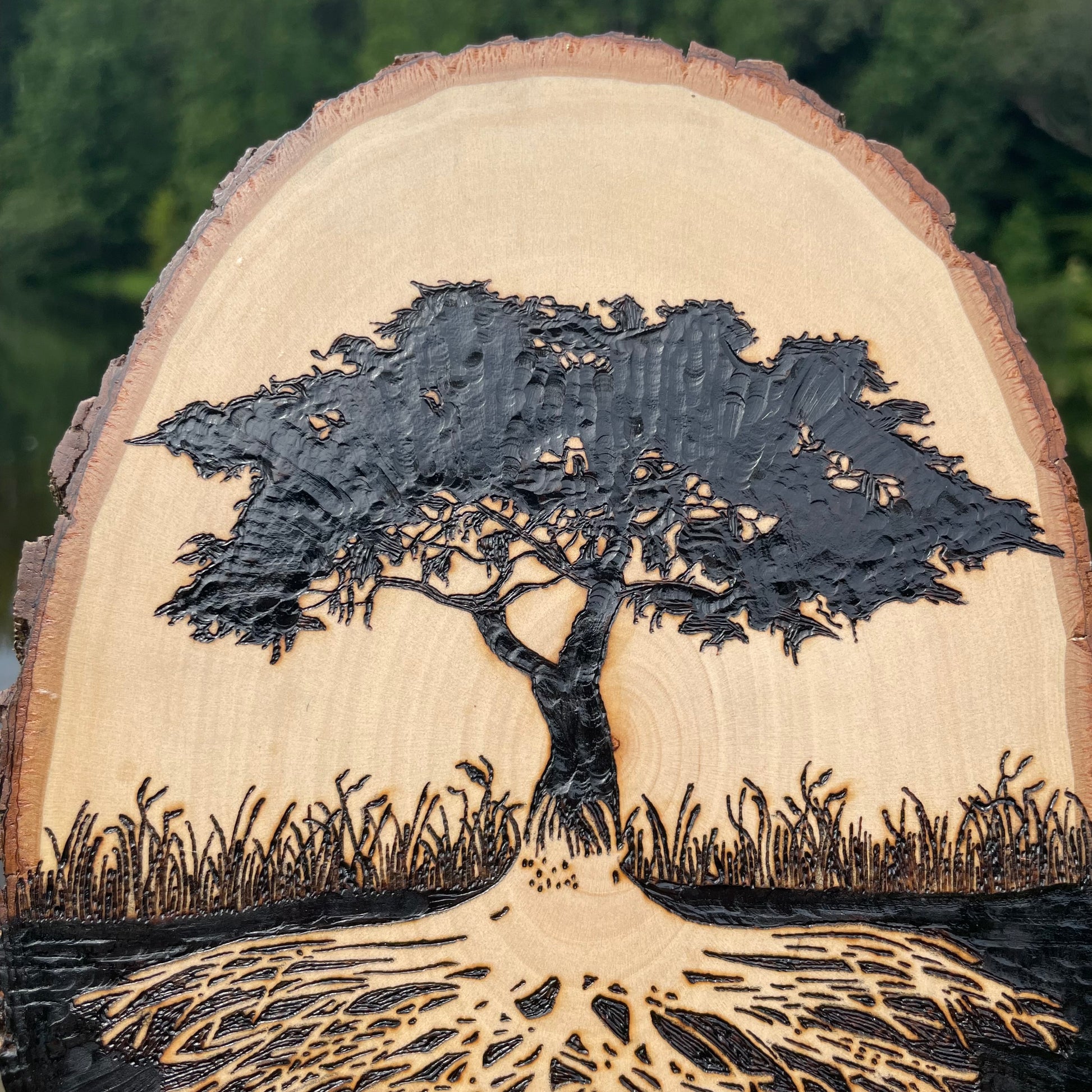I use a hot wire pen to burn this image onto the wood slice. No laser printers here! Rest assured that hard work and love was put into your piece. The tree of life takes me about 10 hours to make not including sealing the wood. I use a high gloss polyacrylic finish to seal the wood. This will protect the piece from general wear and tear, but it will not protect it from water, sun exposure, or dropping. My favorite part to burn on this piece is the tree roots. It is tedious and you have to be precise. I find beauty in the fine details and I believe that is what makes this piece so unique.