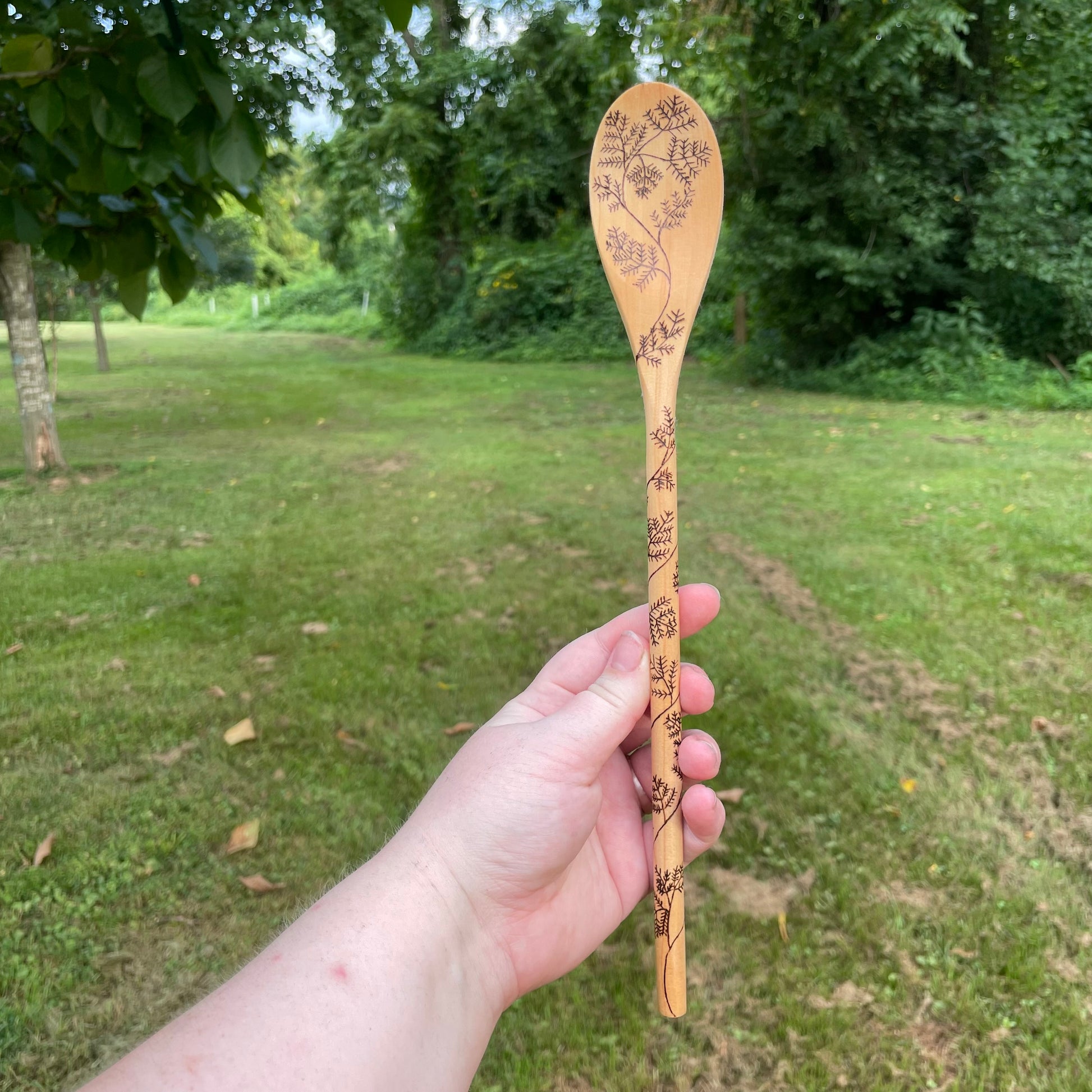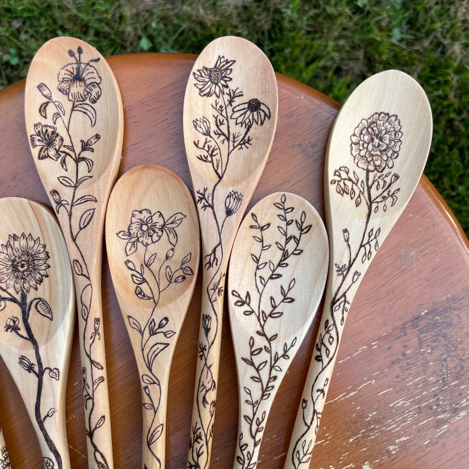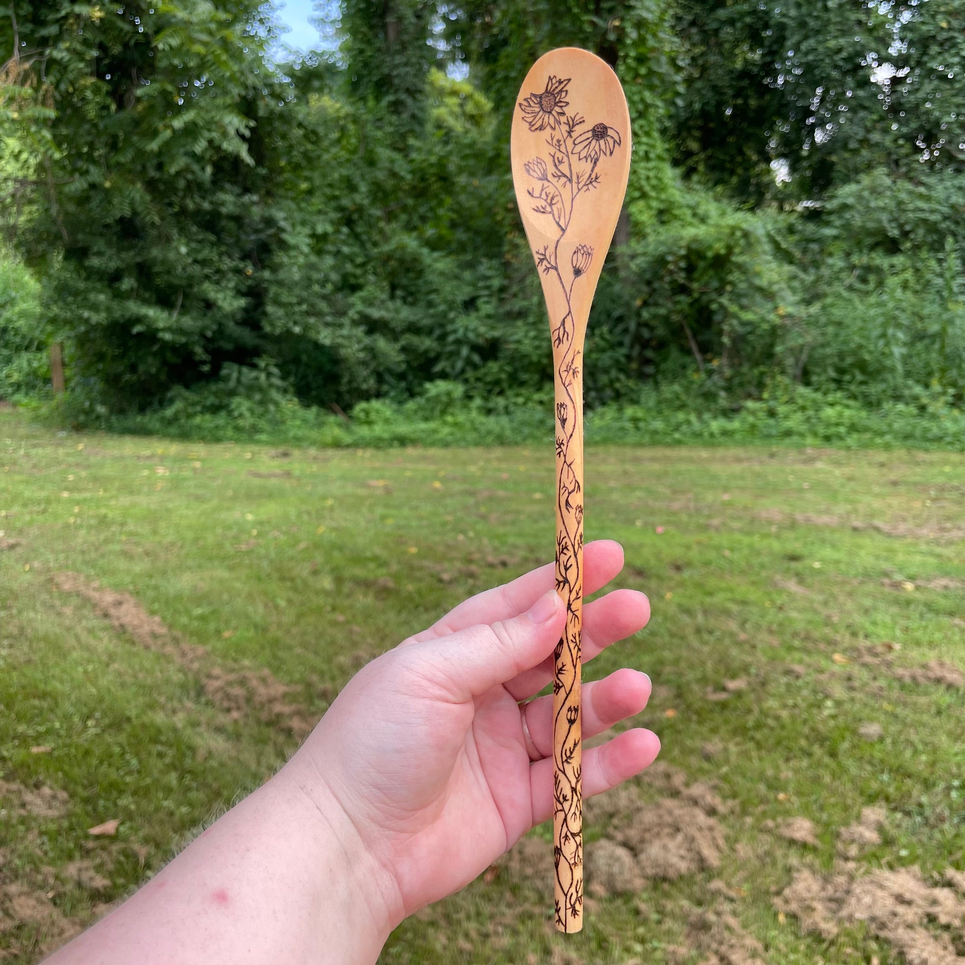 -These wooden spoons were burned by hand using a pyrography pen. No laser printers here! Rest assured that hard work and love went into your order. They are then coated in a food safe mineral oil/beeswax mixture.